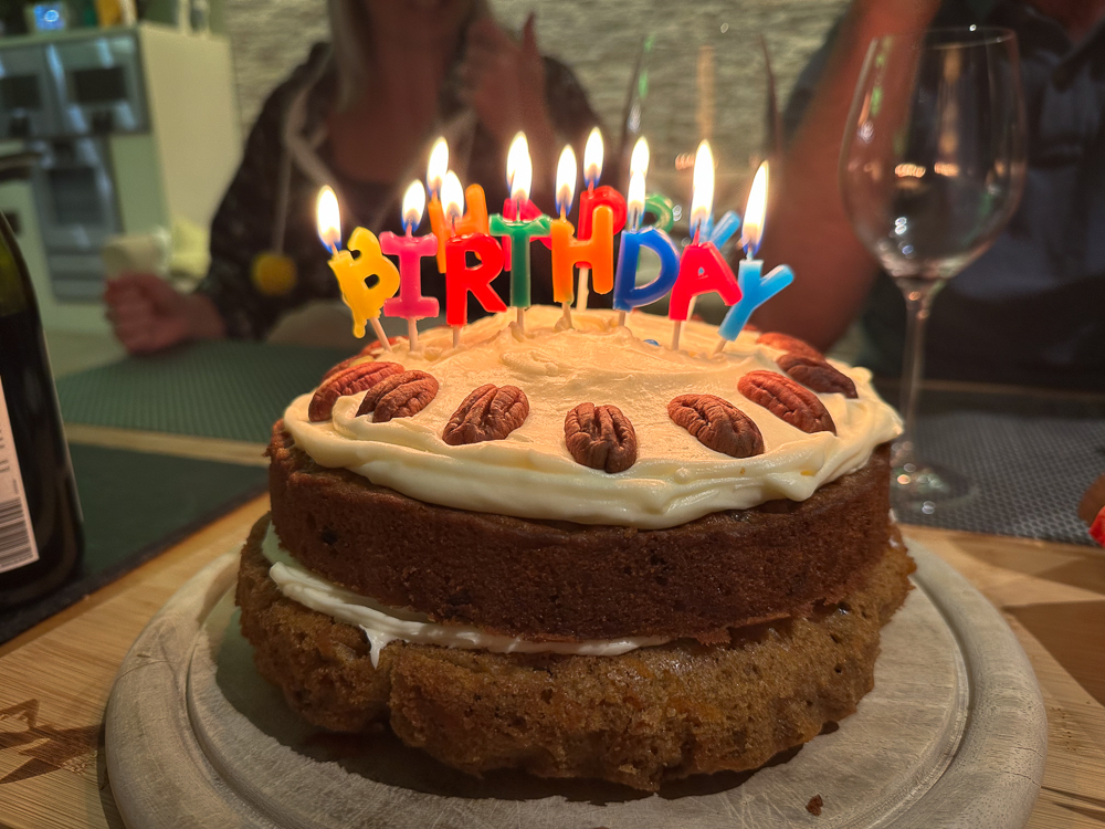 Nigel celebrated his 63rd trip around the sun with the help of an Amy-Jane special carrot cake at the same time as Jonathans’ sister, Debra, came to visit from Germany along with her daughters Natalie and Katie. We had met them several times in the past (see their 2016 visit) and even visited their home in Altenahr, Germany before the devastating floods of July 2021 destroyed much of the town.