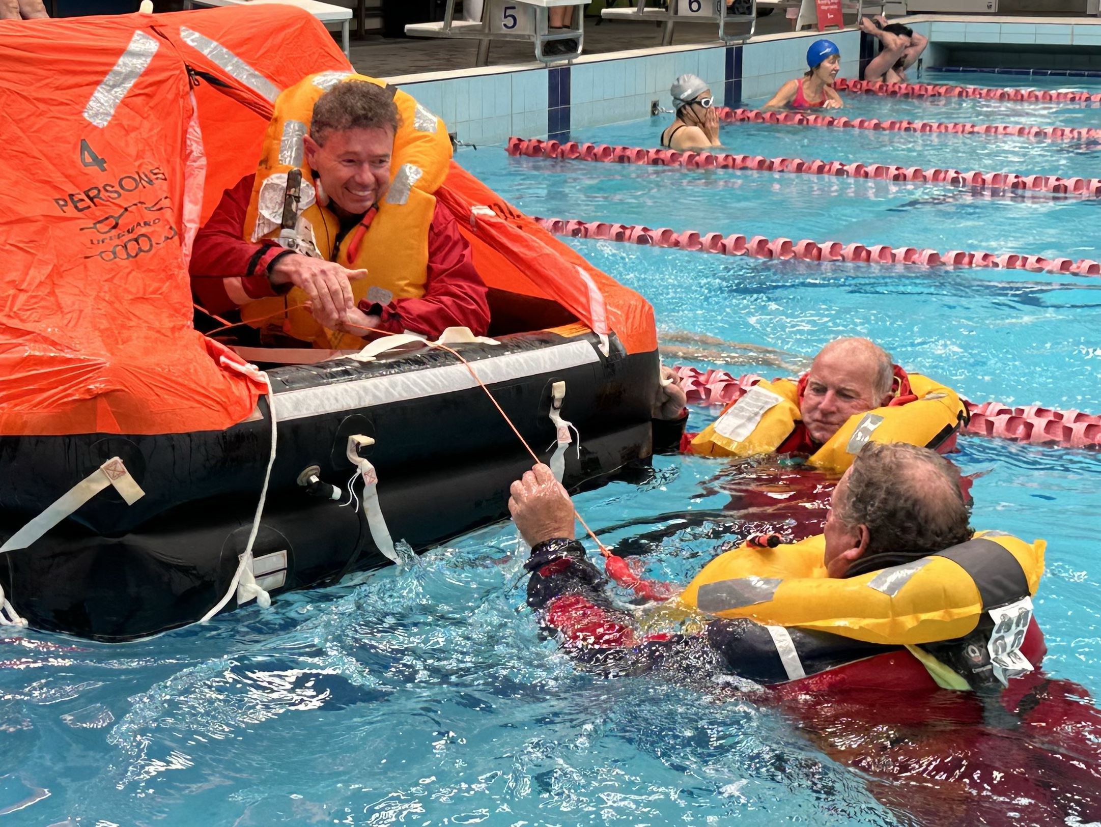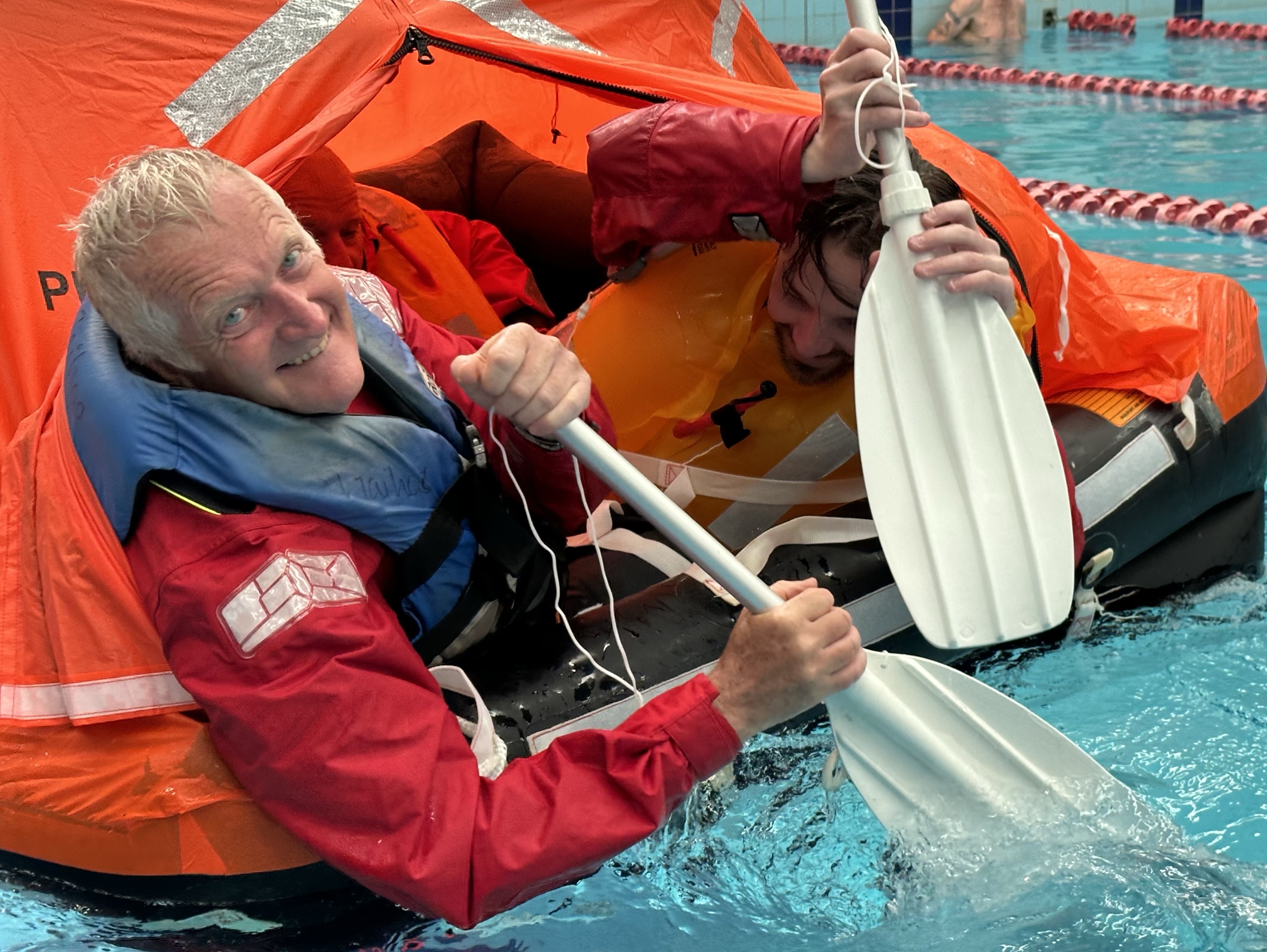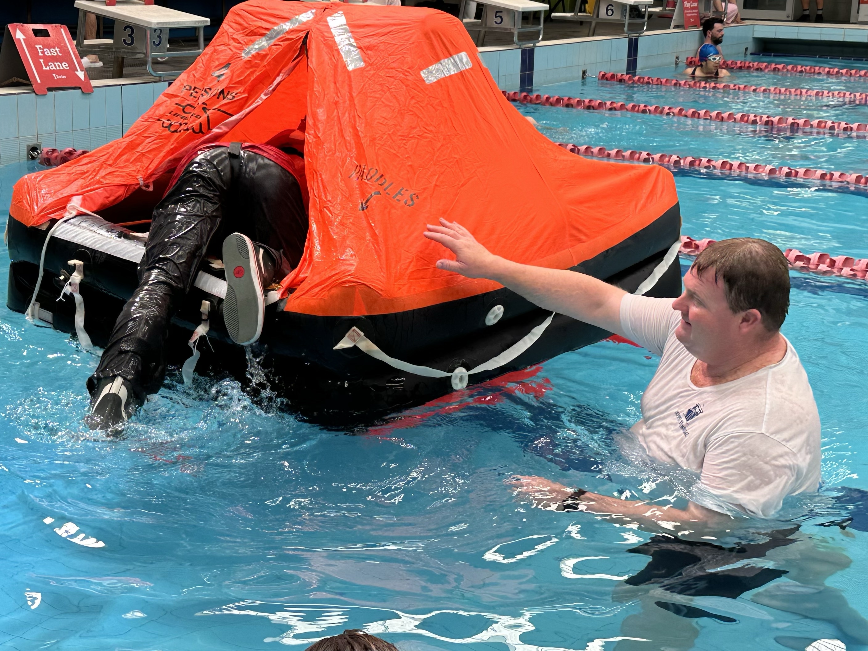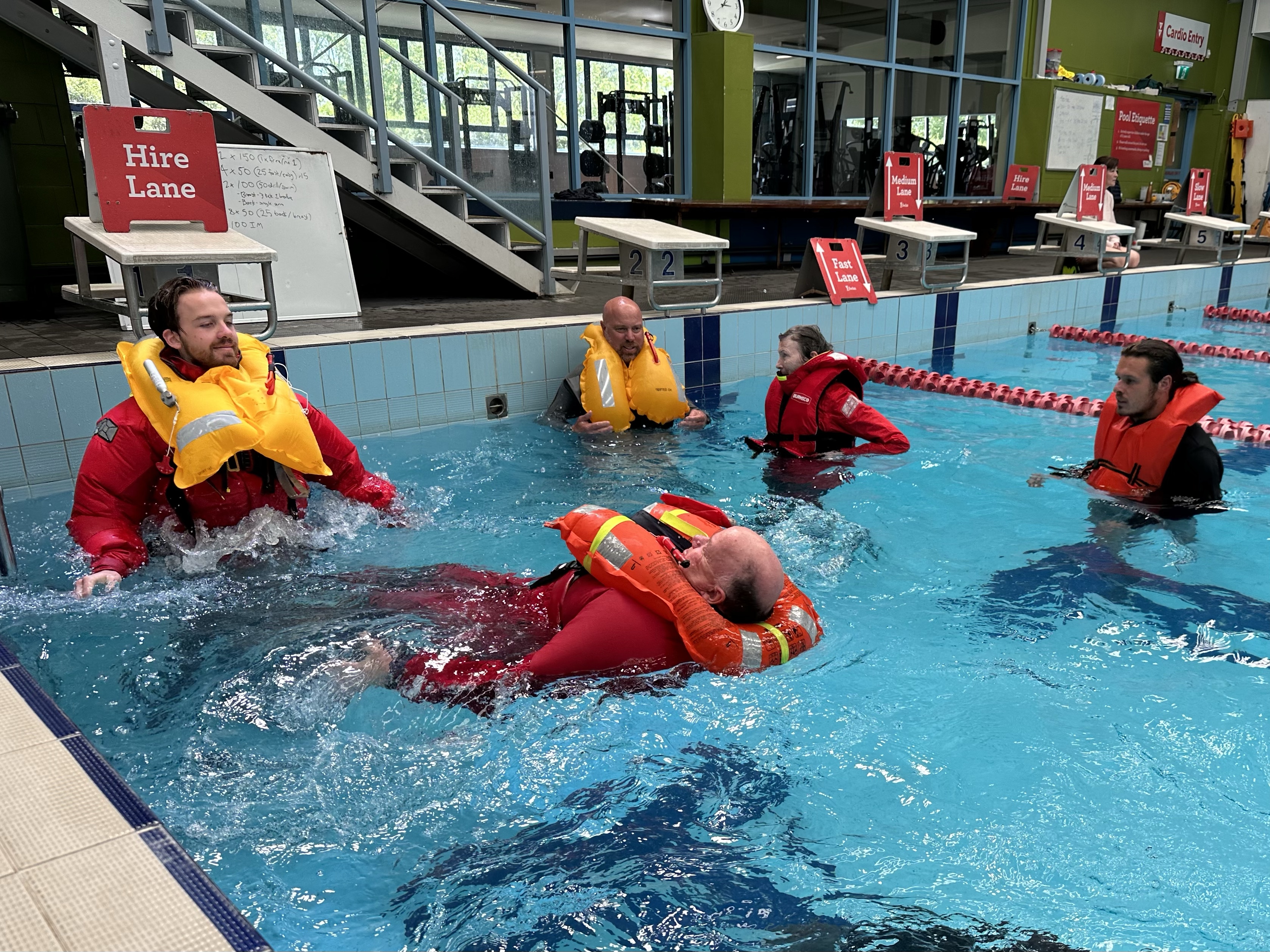 The course was a fabulous mix of theory, discussion, demonstration, hands-on use of safety equipment and practical exercises in a swimming pool using a real life raft while wearing our full wet weather gear.