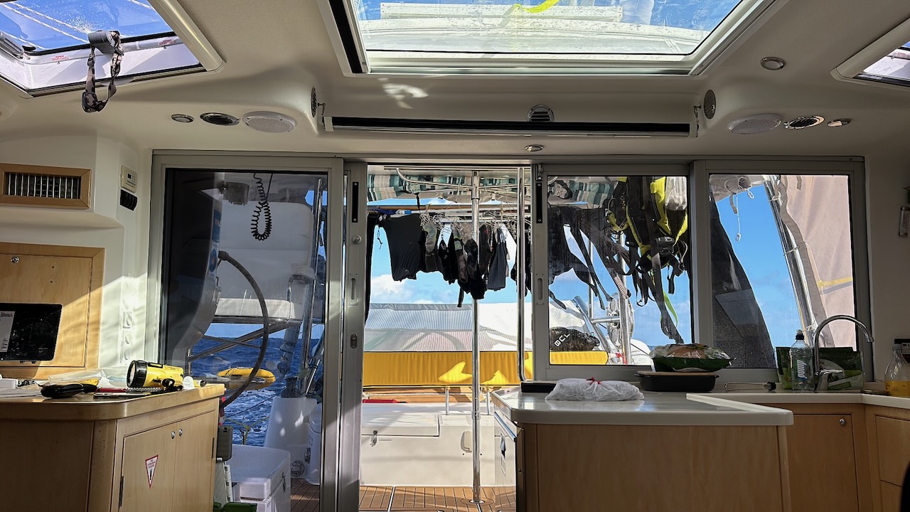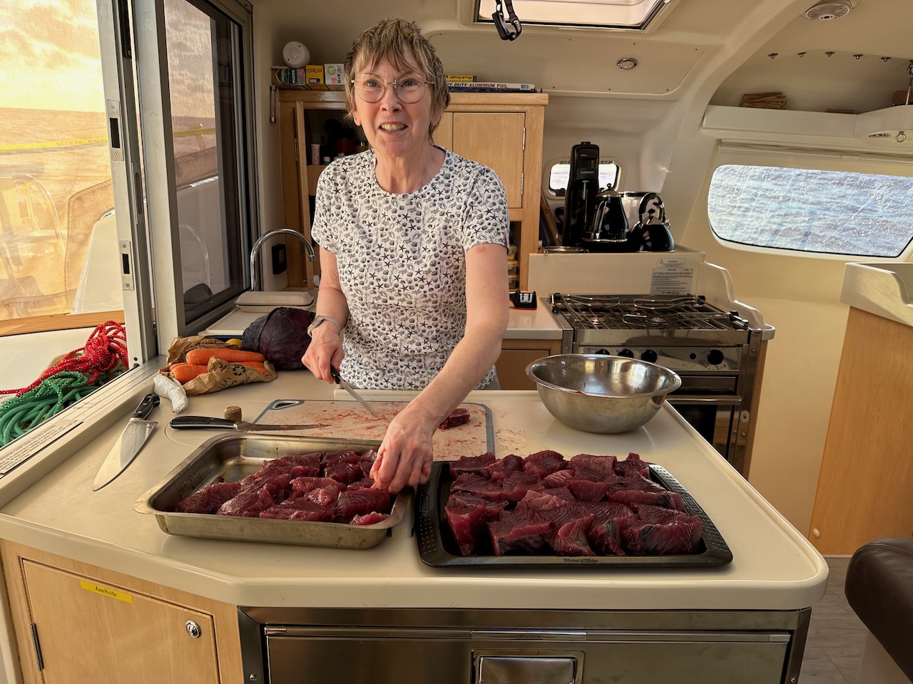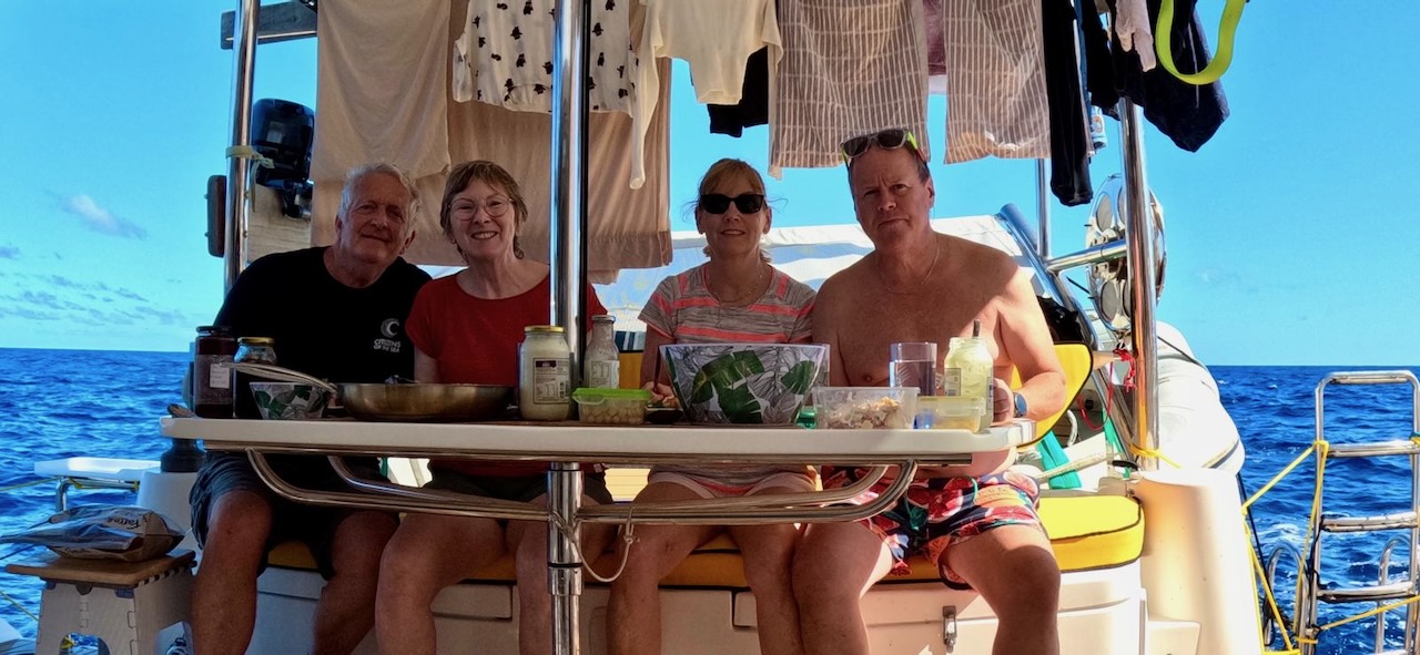 It turned out that there were fish on two rods and one hand line. We lost one of the ones on a rod but Nigel pulled in one on a hand line while Jonathan reeled in the second rod. Final result was two yellow fin tuna which were vacuum bagged and despatched to the freezer as we head to Minerva – all the scraps provided us with a delicious lunch. Notice Sue’s homemade bread in the images below. We are eating exceedingly well. Unfortunately everyone likes the crust. So, to avoid fights, every crust needs to be cut into four pieces!