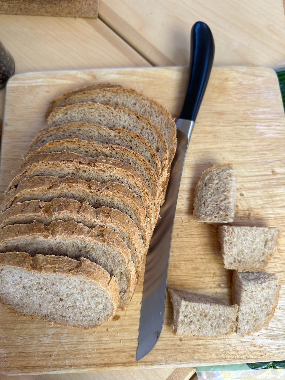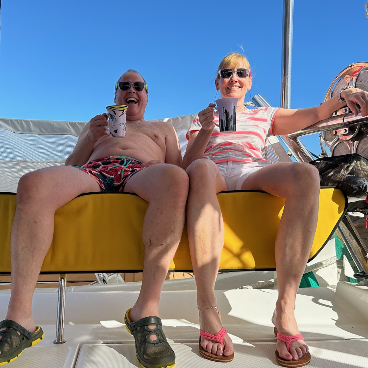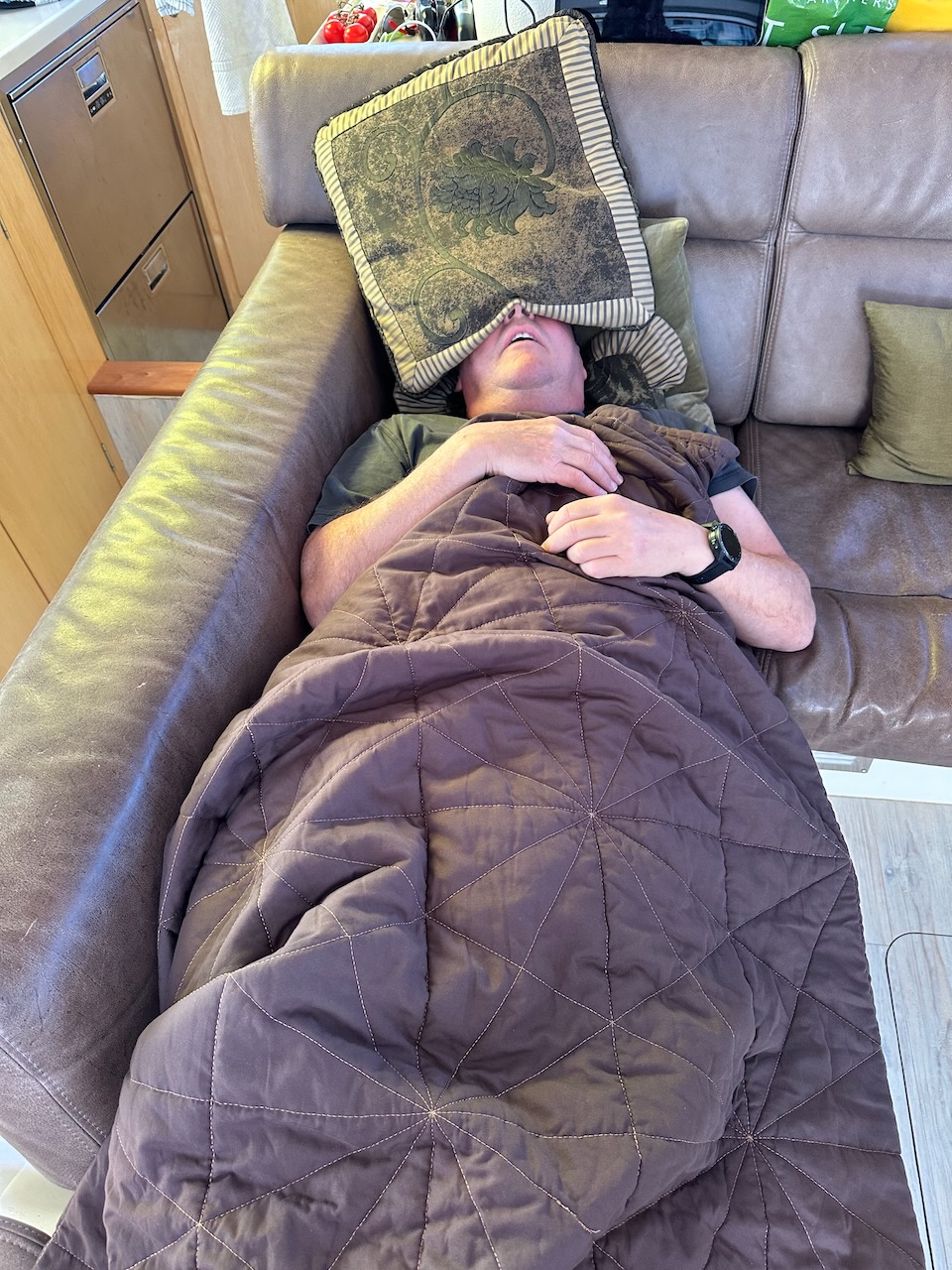 It turned out that there were fish on two rods and one hand line. We lost one of the ones on a rod but Nigel pulled in one on a hand line while Jonathan reeled in the second rod. Final result was two yellow fin tuna which were vacuum bagged and despatched to the freezer as we head to Minerva – all the scraps provided us with a delicious lunch. Notice Sue’s homemade bread in the images below. We are eating exceedingly well. Unfortunately everyone likes the crust. So, to avoid fights, every crust needs to be cut into four pieces!