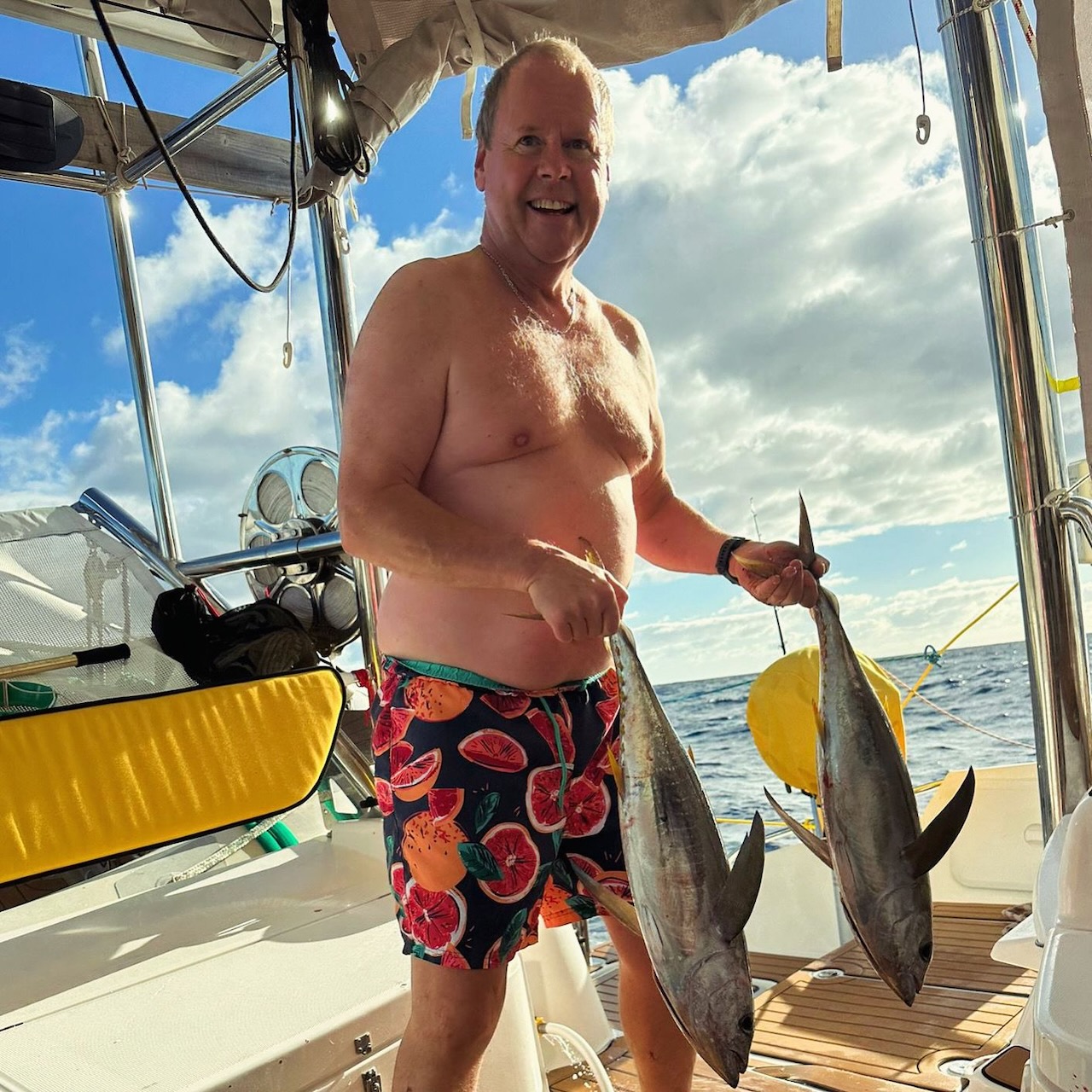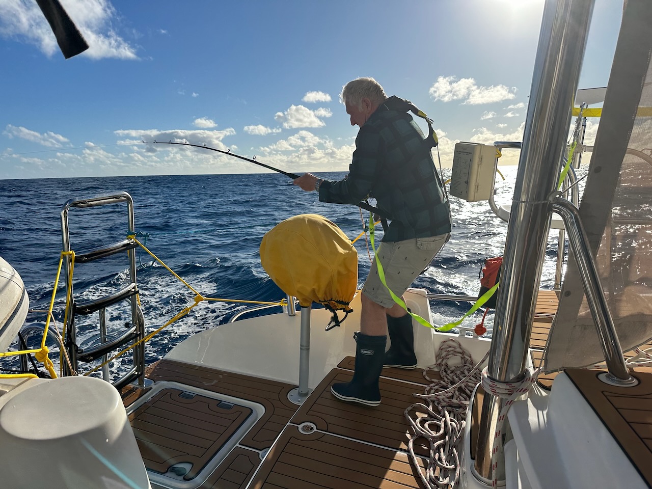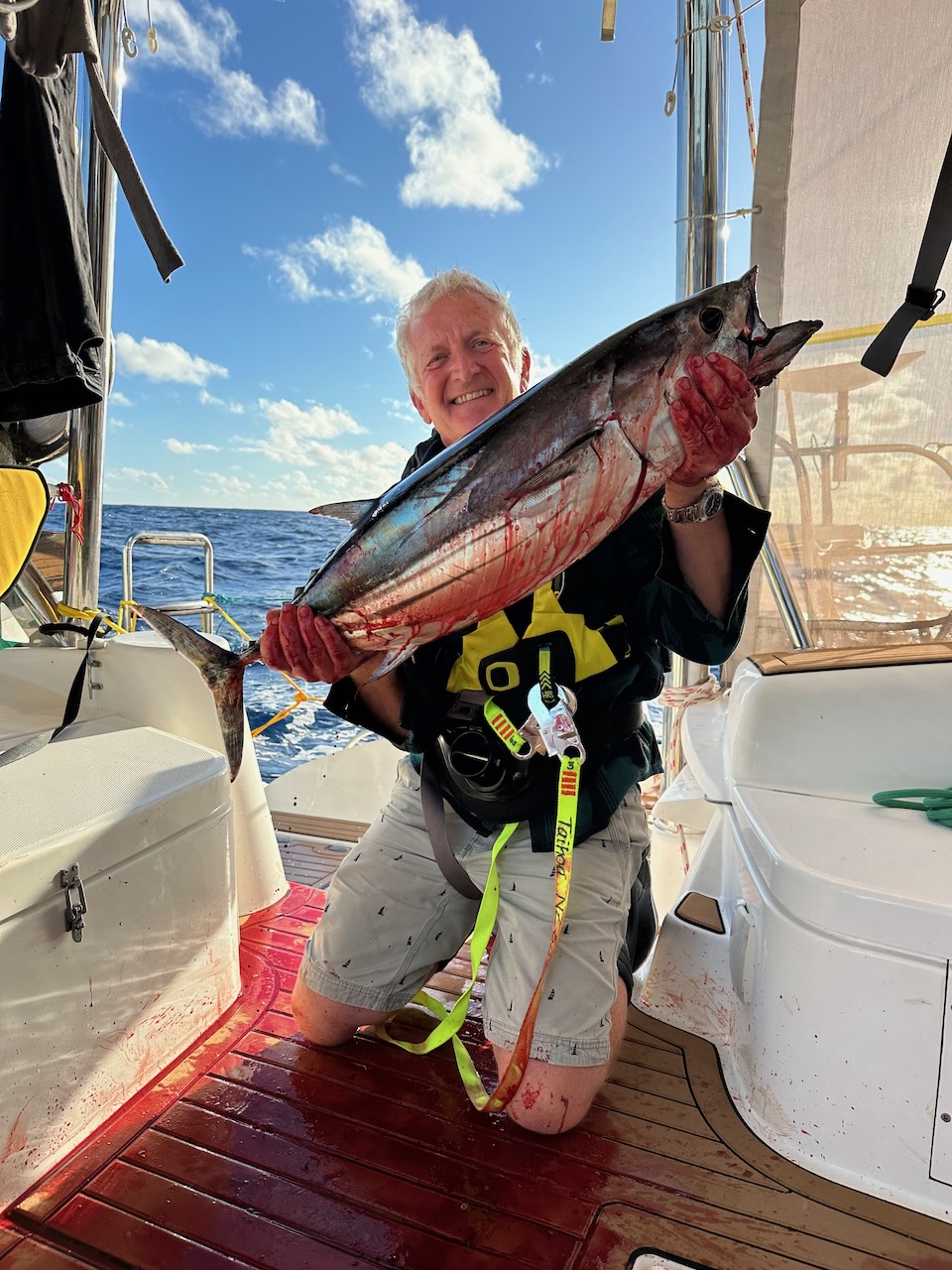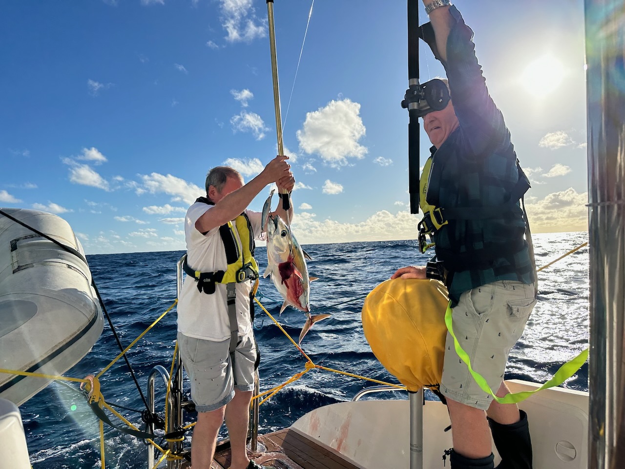 July 1st brought our first fish of the trip – not including flying fish which managed to get onboard unnoticed and leave a trail of scales all over the decks. Nigel was first to the rod and brought in a good size skipjack tuna. Enough meat to keep us going for a while – we even managed smoke some on the BBQ.