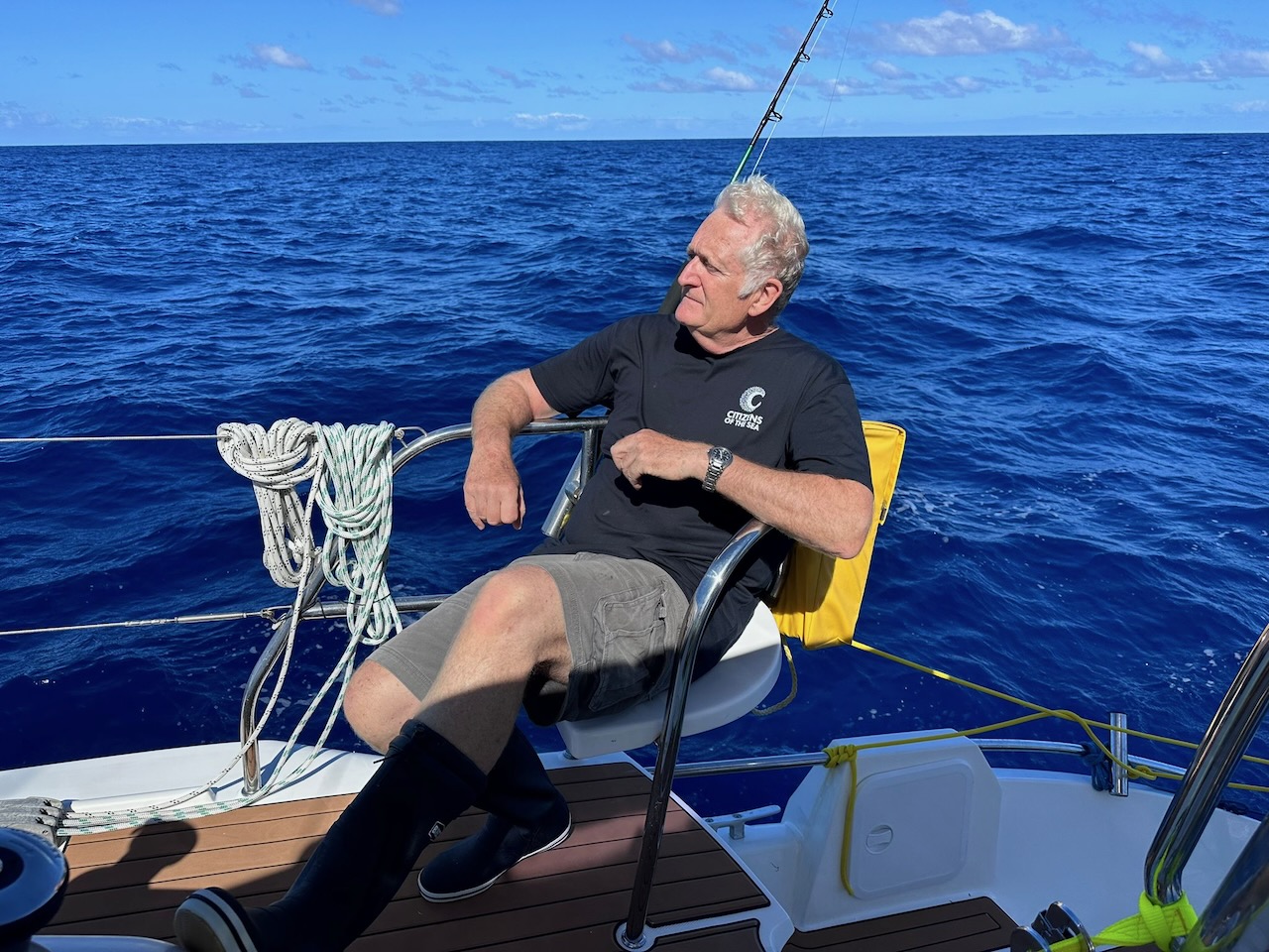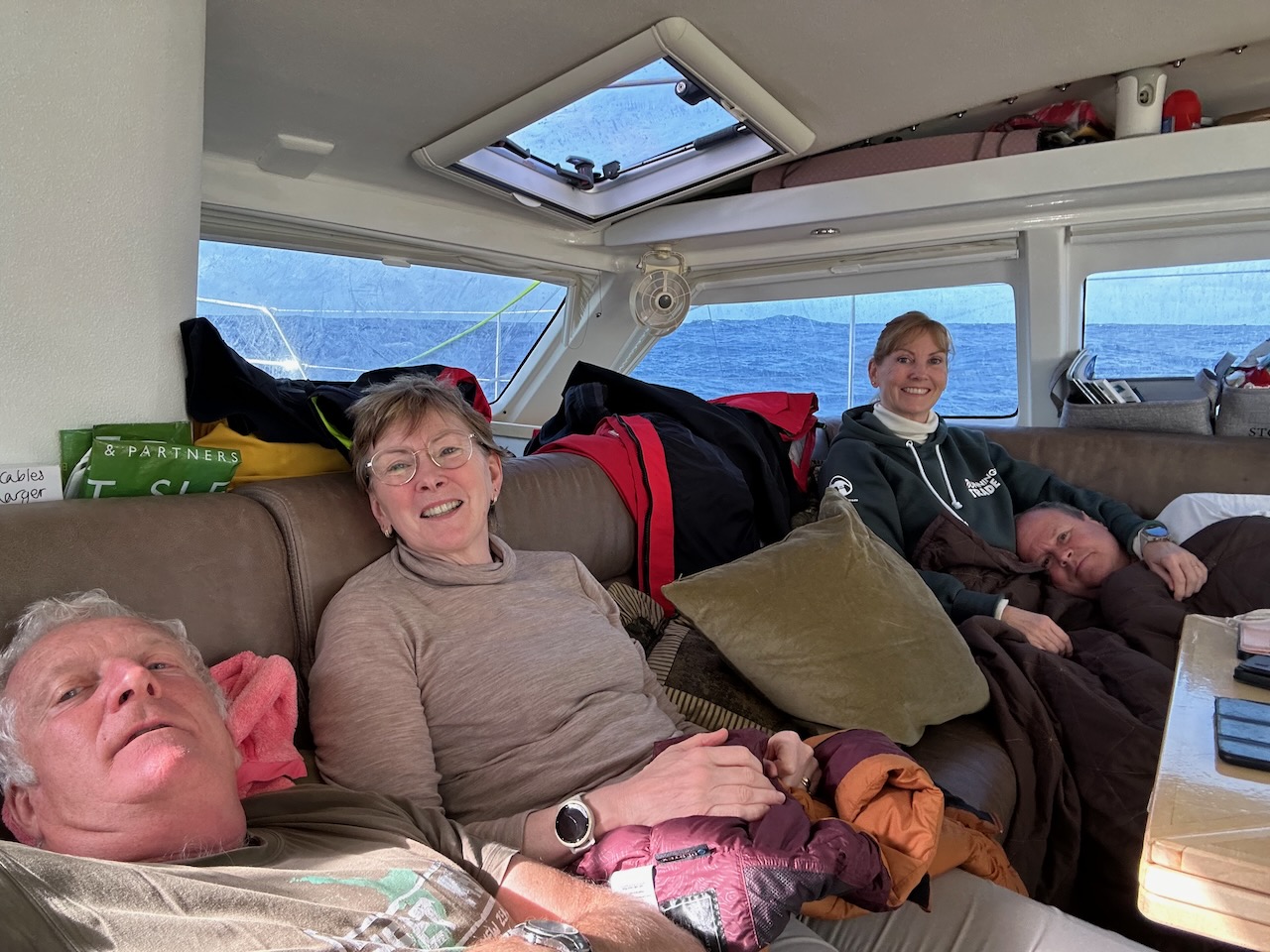 At 8:30 on the morning of our third day we gybed and set the Genoa wing on wing with the wind almost dead behind us and the boat pointing directly at Minerva. By 2pm we recorded “Much calmer seas (2-2.5 metre swell, more consistently from the south). First load of washing done. Crew feeling much better”