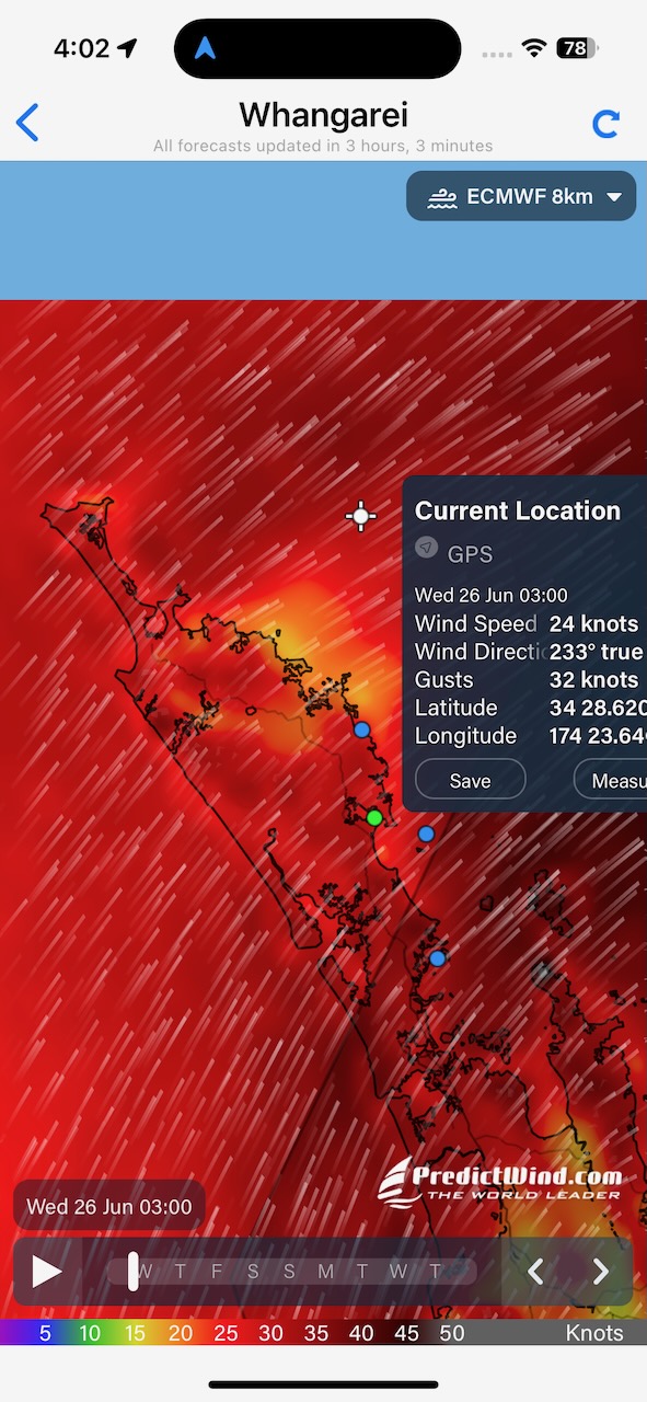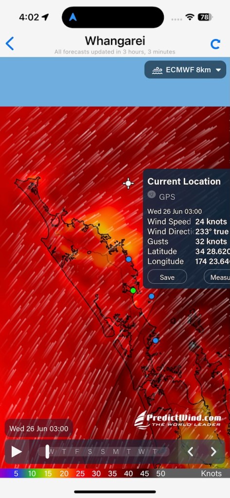 This is our weather map as we head up the coast of New Zealand in darkness after leaving the shelter of Marsden Cove Marina at around 1pm.