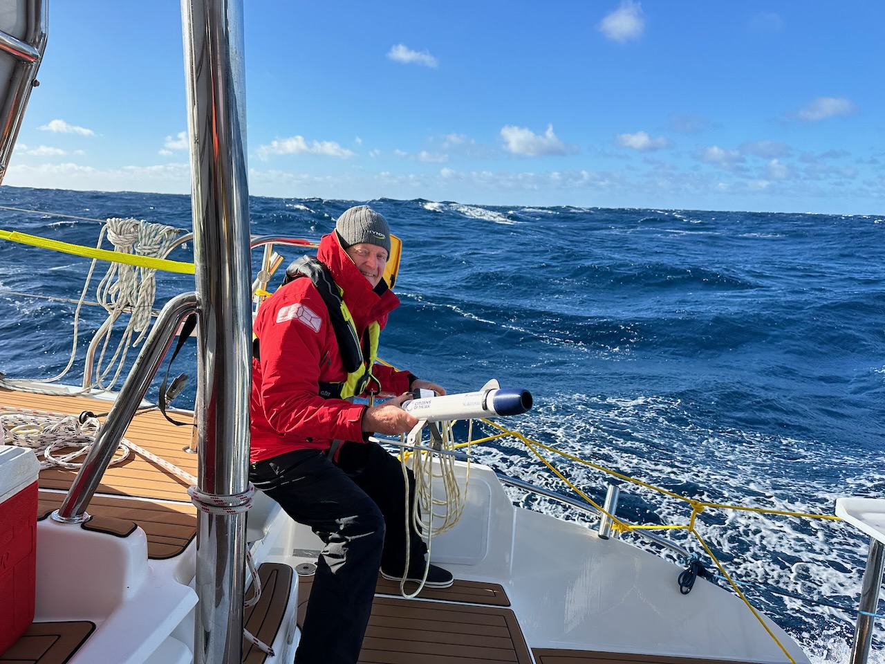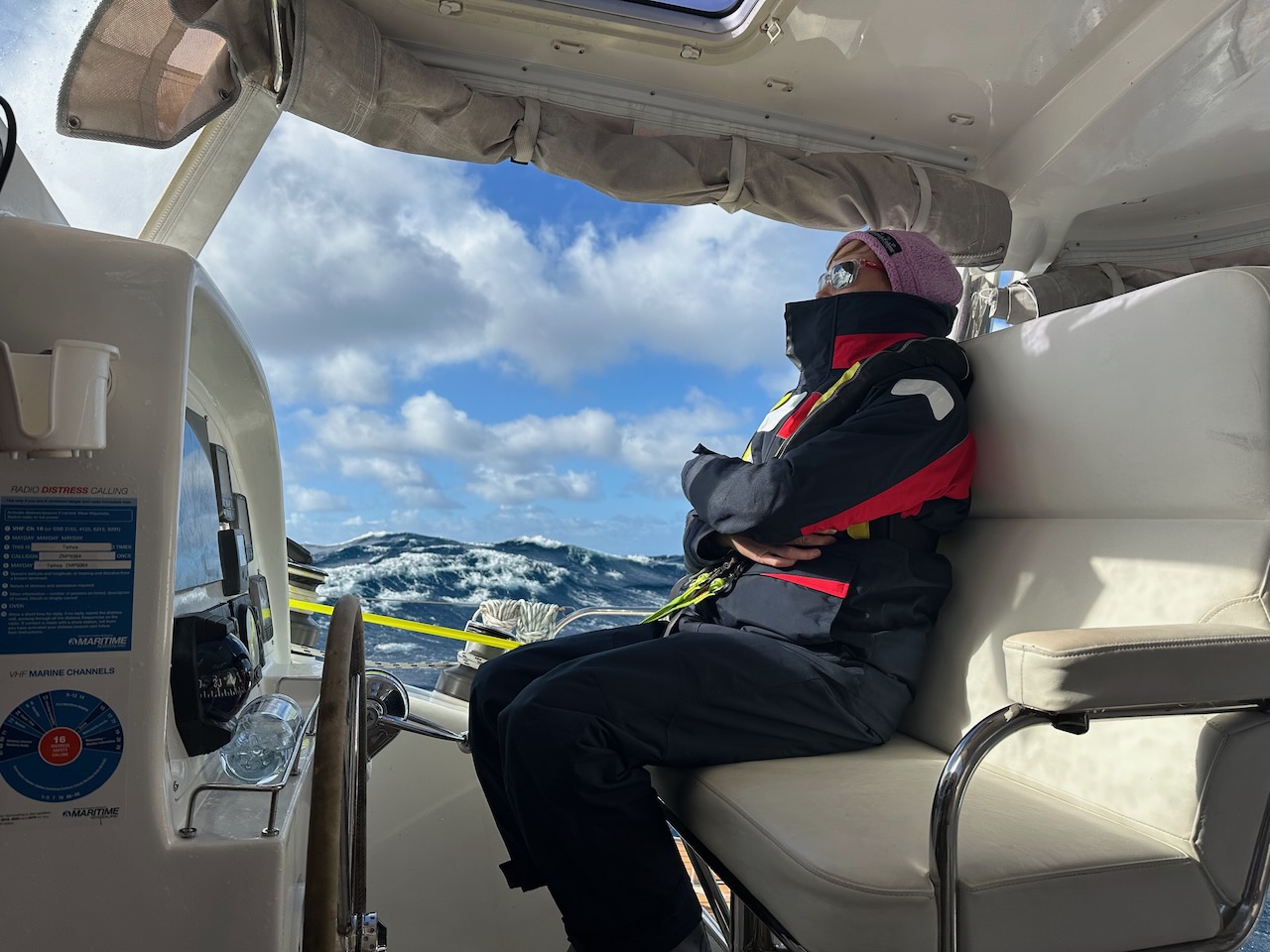 It was all very exciting as we managed 7-9 knots SOG (speed over ground) with occasional spurts of up to 13.5 knots as we surfed down a wave. Unfortunately, the sea state worsened and we were forced to furl the Genoa further and slow down to around 6.5 knots.