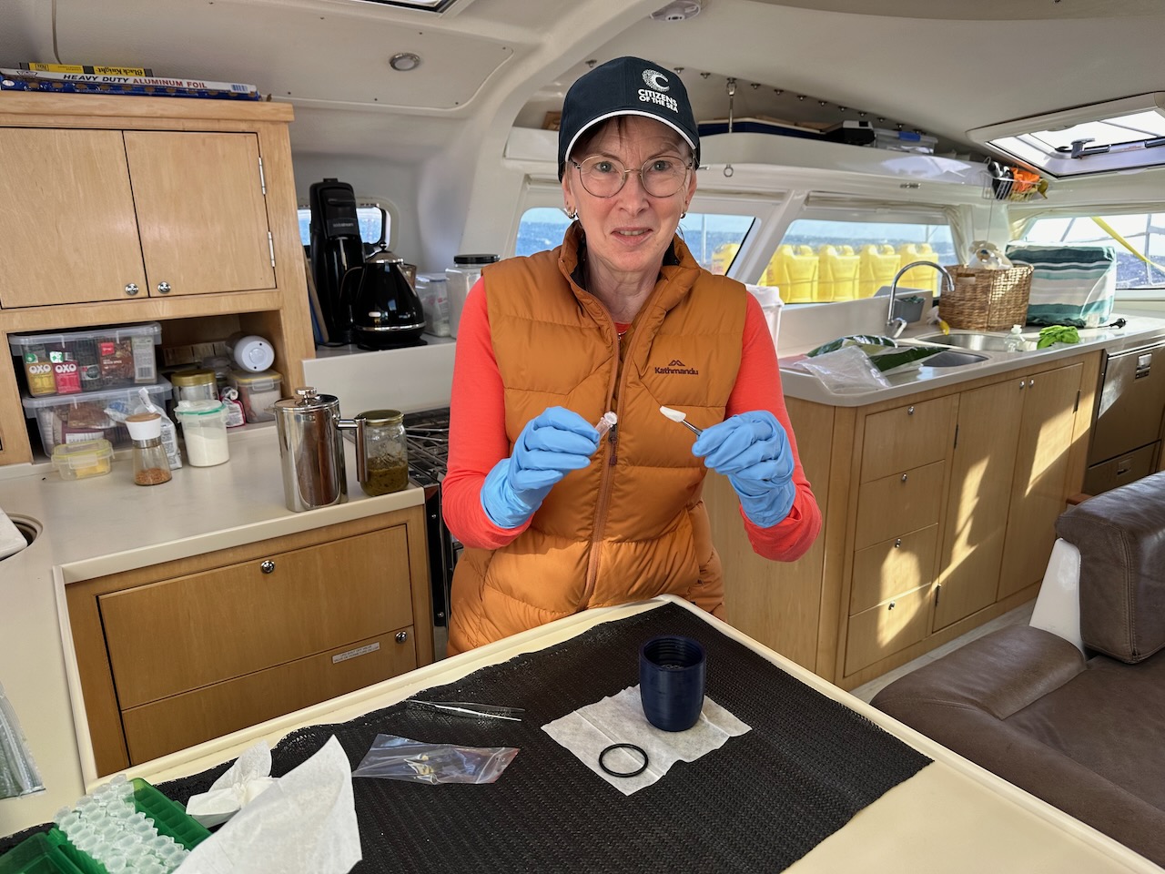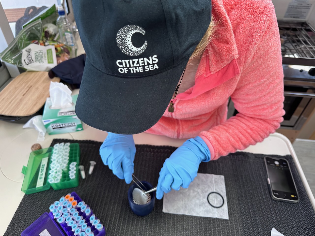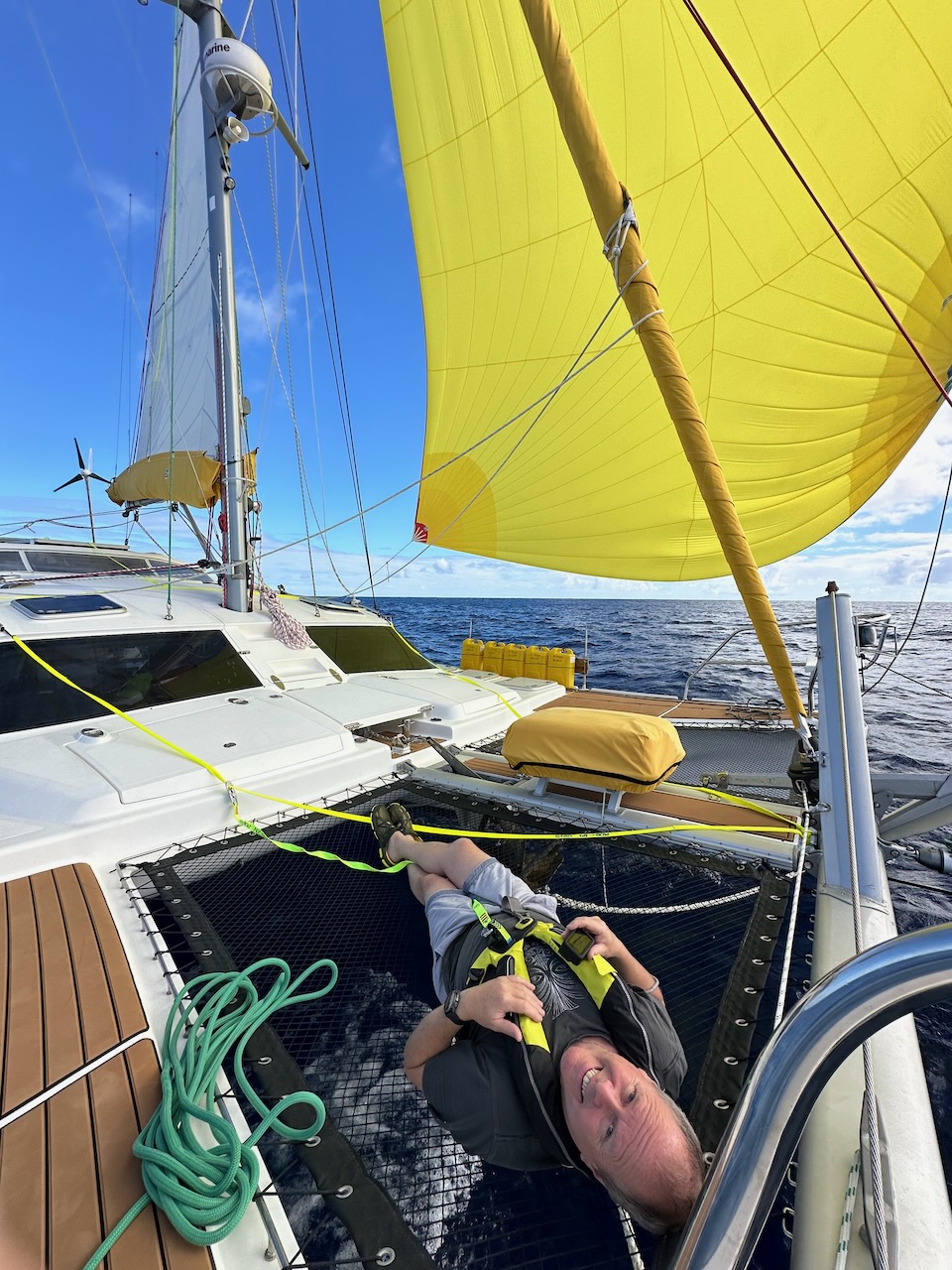 Somewhat at odds with the carnage pictured above, we have signed up the a group called Citizens of the Sea. We have volunteered to take daily samples of the sea while on passage. This involves towing a ‘torpedo’ which has a sieve to filter the water. The fine mesh is then stored in a preservative and kept in the fridge until we hand over the whole collection once we arrive in Fiji. We collected three lots of samples each day and some clever technology records our exact position, speed, depth of water and the water temperature. The samples will be analysed for DNA and can apparently tell exactly what species have been in the vicinity. We are looking forward to seeing the results later this year.