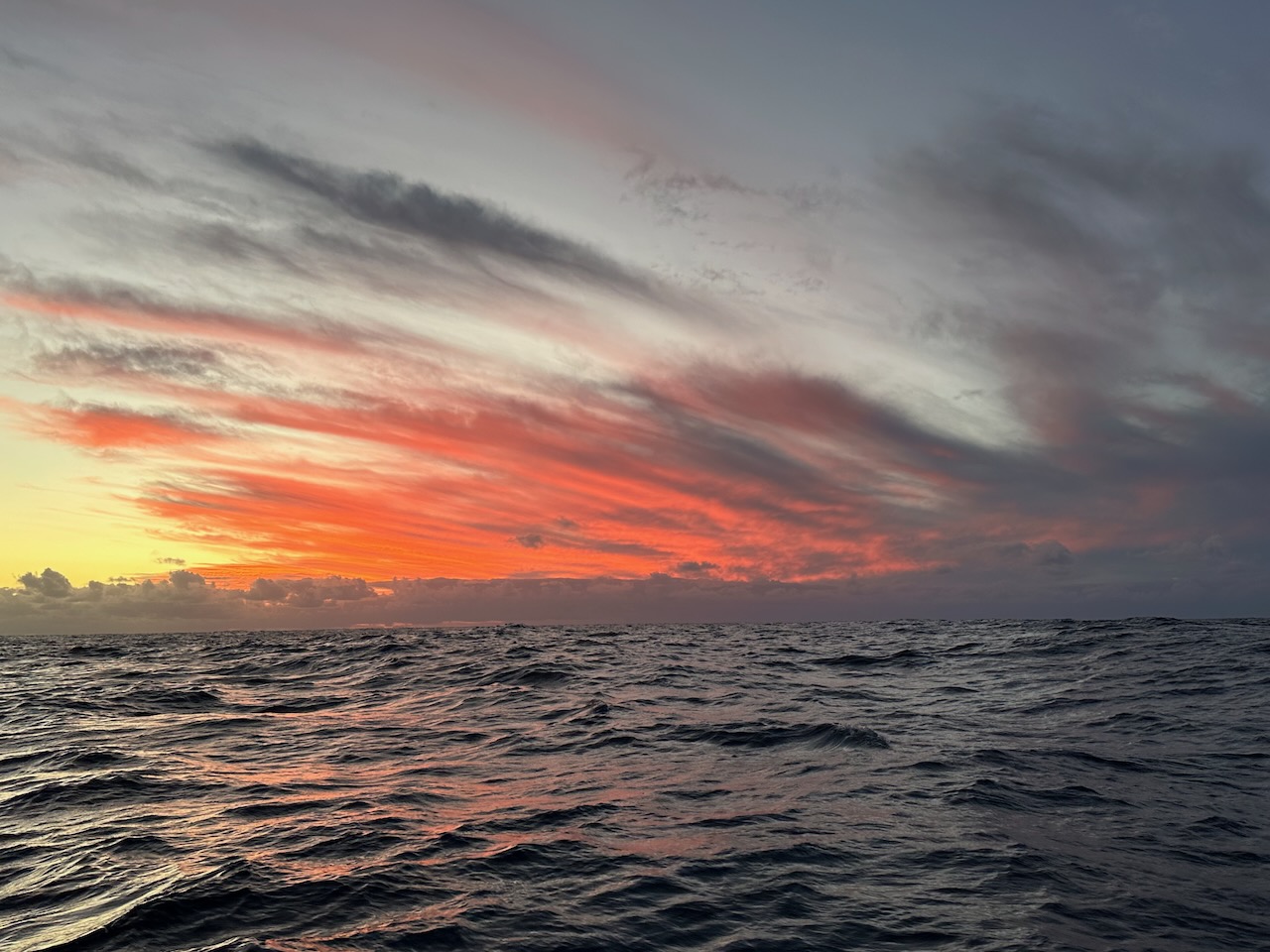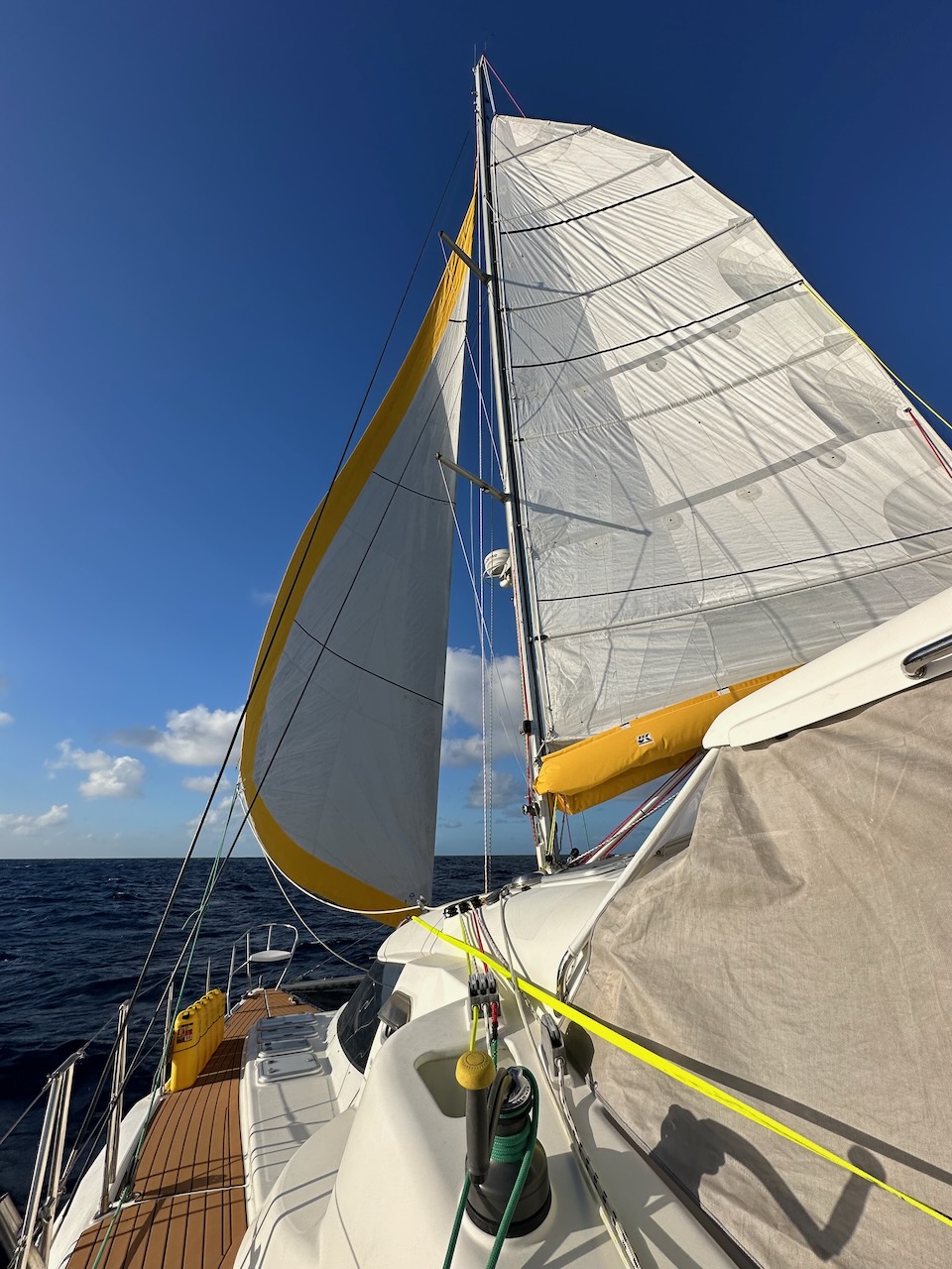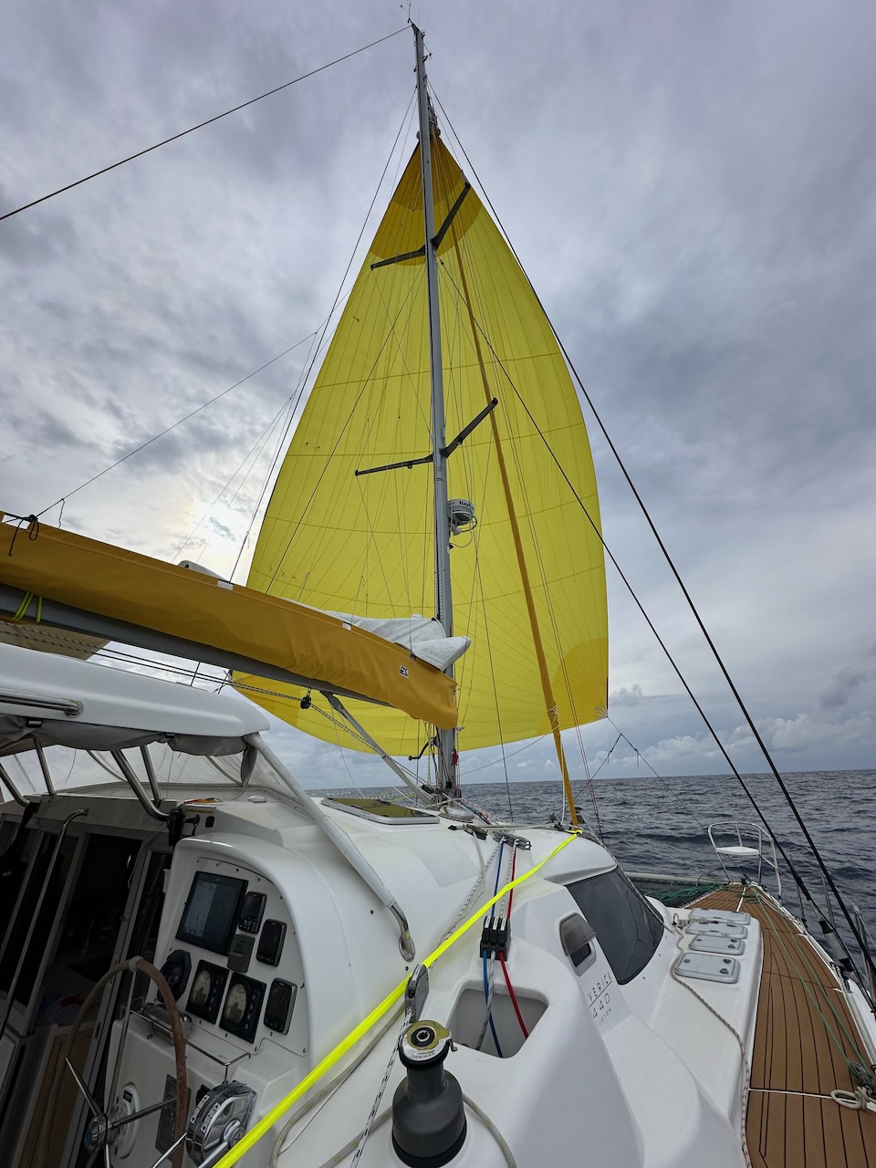 This turned out to be a blessing in disguise. During the night several squalls brought crazy swirling winds which would have made a mess of the spinnaker. As it was, we had to start the engine and furl the Genoa for an hour or so until the wind settled and we could return to some downwind sailing.