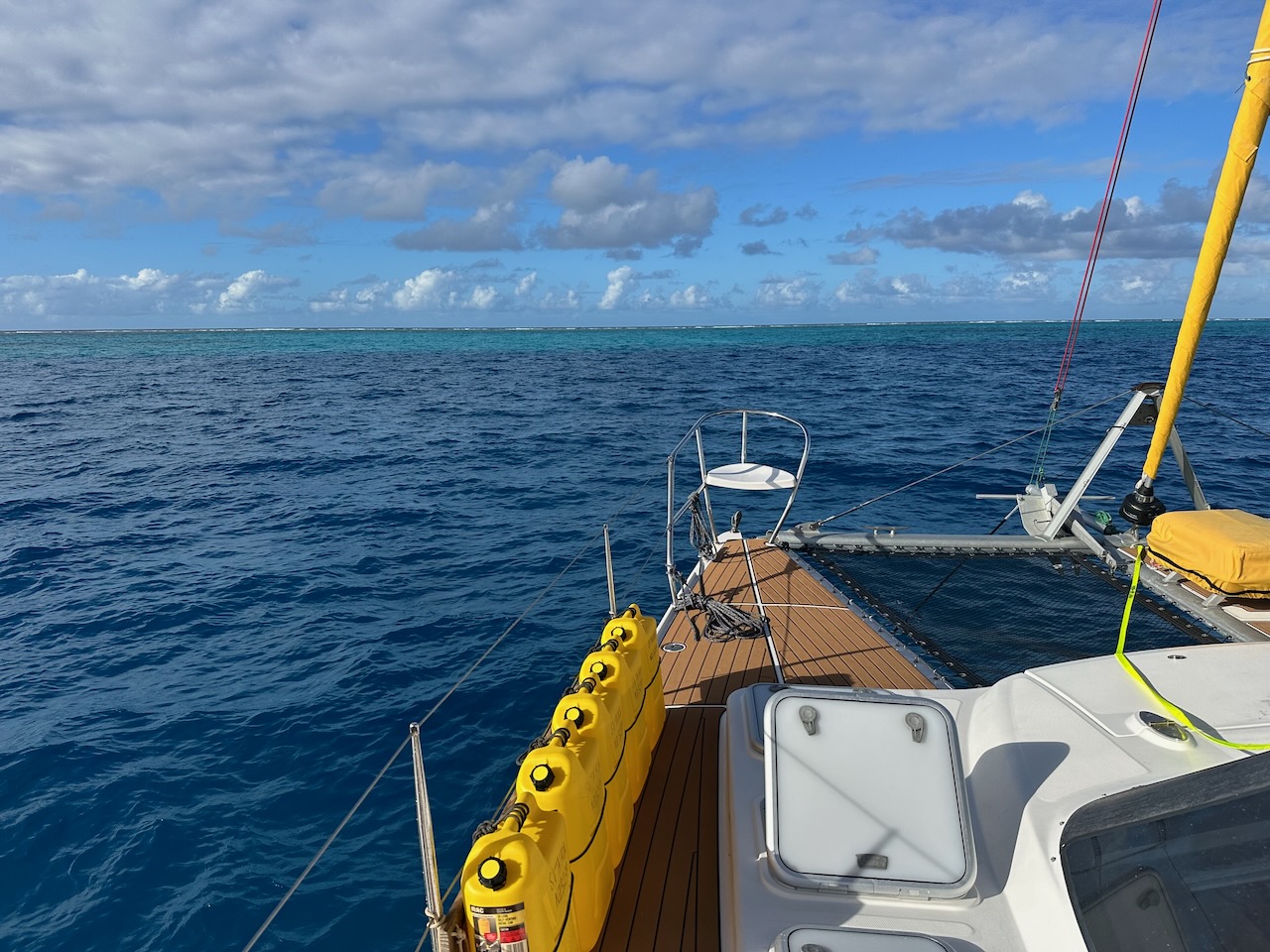 We need not have worried. The waypoints took us smoothly through the centre of a reasonably wide passage and into the tranquil waters of the lagoon. A calm oasis in the middle of an ocean that had behaved like an old agitator washing machine until now.