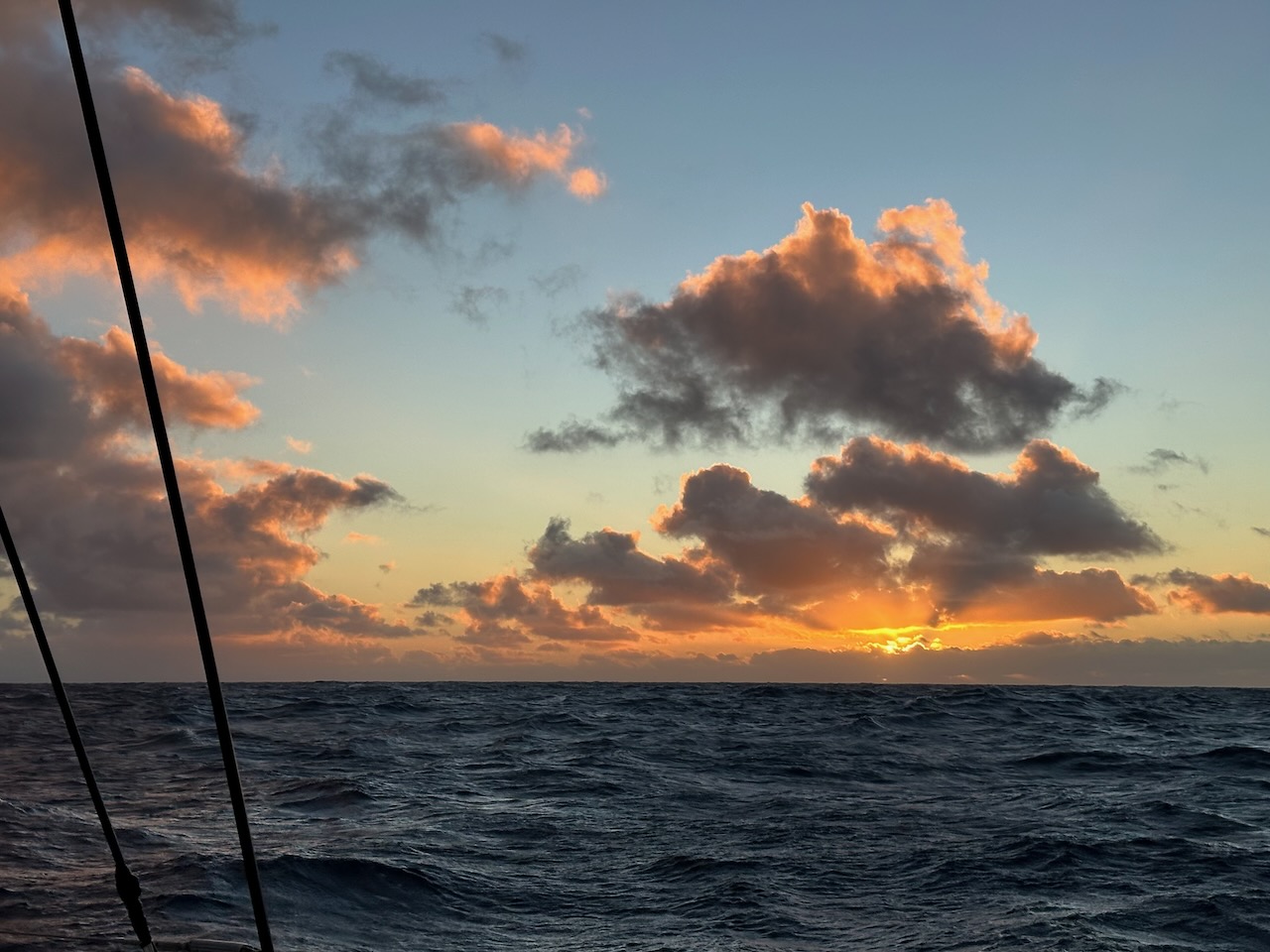 24 hours into the trip the swell peaked at 3-4 metres but the wind was dropping and the sea becoming a little less choppy. By midnight on the second night we were enjoying downwind sailing under the mainsail only and Claire, who had been suffering from sea sickness, managed to record in the log “Pretty moonrise” – she must have been feeling a little better!