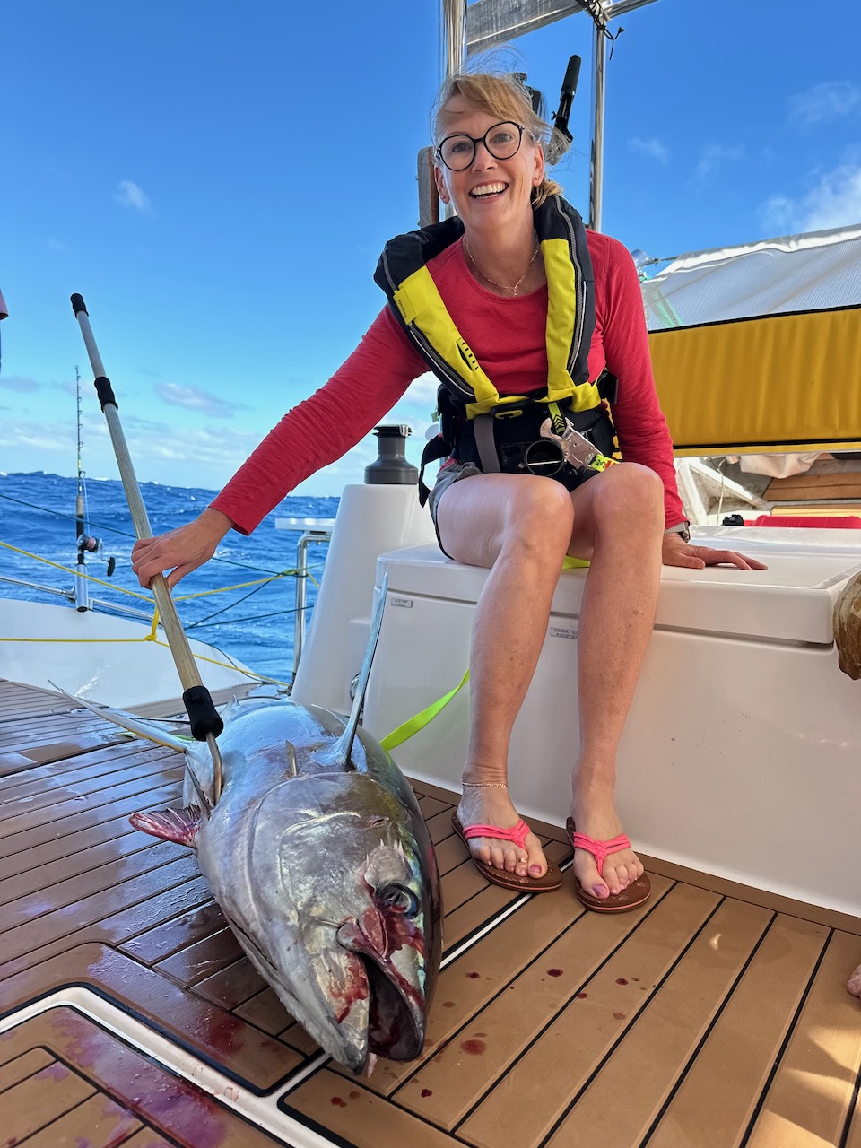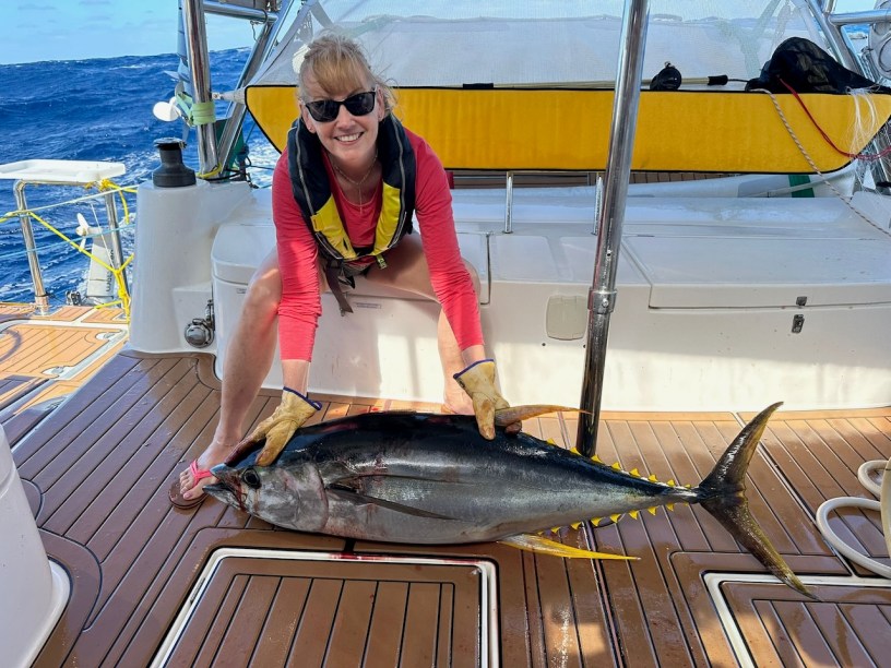 Overnight the wind increased and our log recorded a swell of around 4 metres. Still not too uncomfortable and it certainly didn’t stop us from fishing. At 12:30 the log entry read ” Caught a massive yellow fin (Claire reeled it in). Off course for about 40 minutes. Now back on course and wondering what to do with all the fish.”