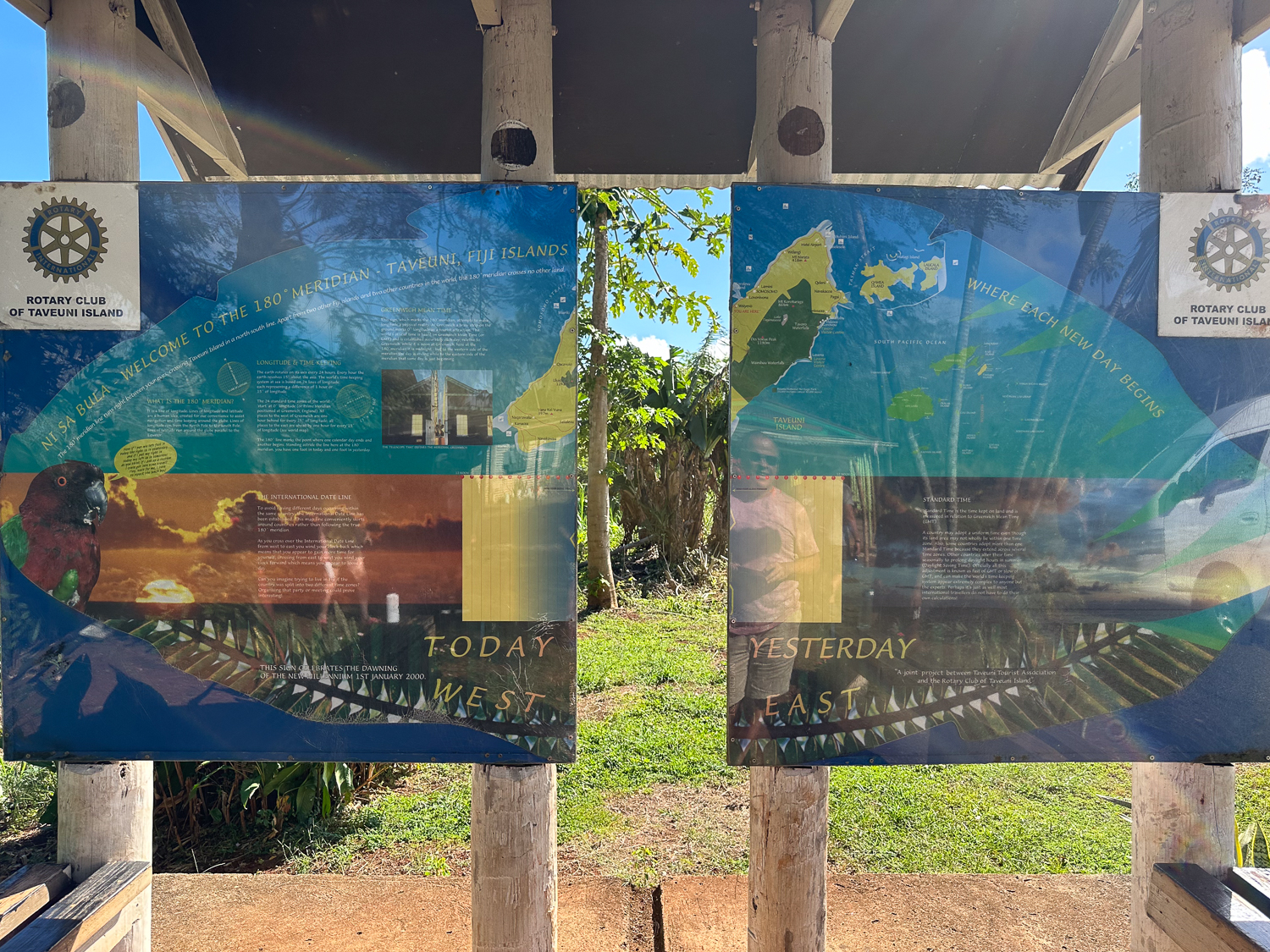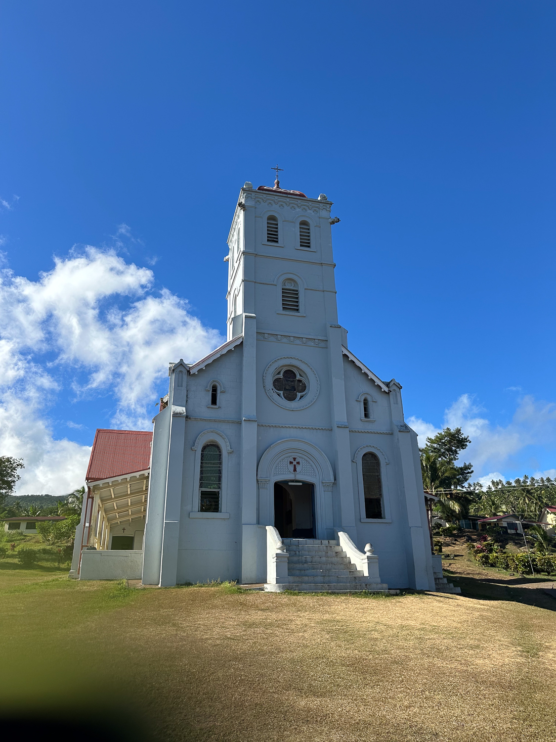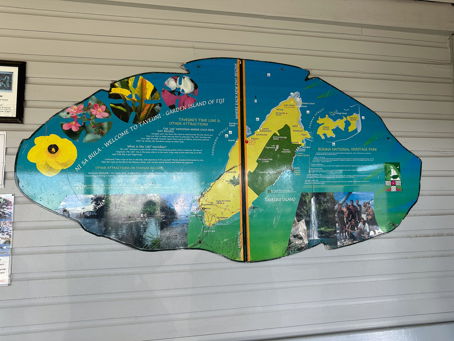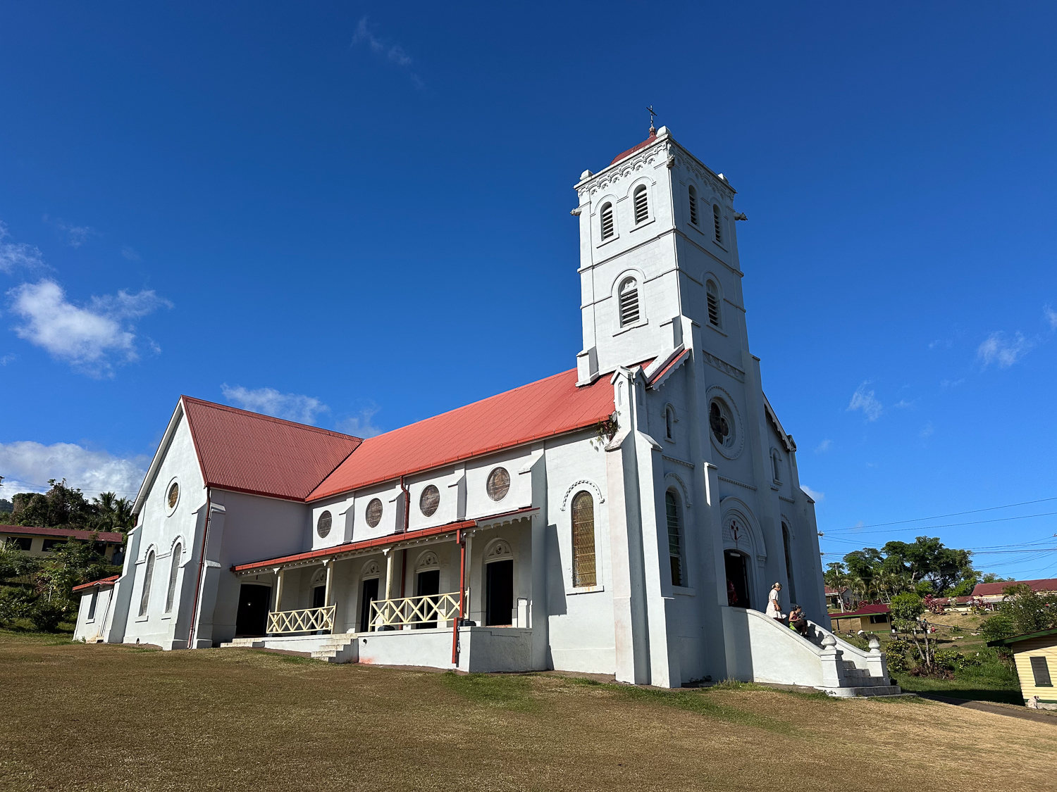 The next day we went on a tour with the resort. It seemed like the best way to see something of Taveuni Island. A relatively early start was needed to fit it all in – a visit to the “cathedral”, the local town (Somosomo – one of three such named towns that we would encounter on the trip), a toilet stop at the airport, and a spot to celebrate crossing the international date line.