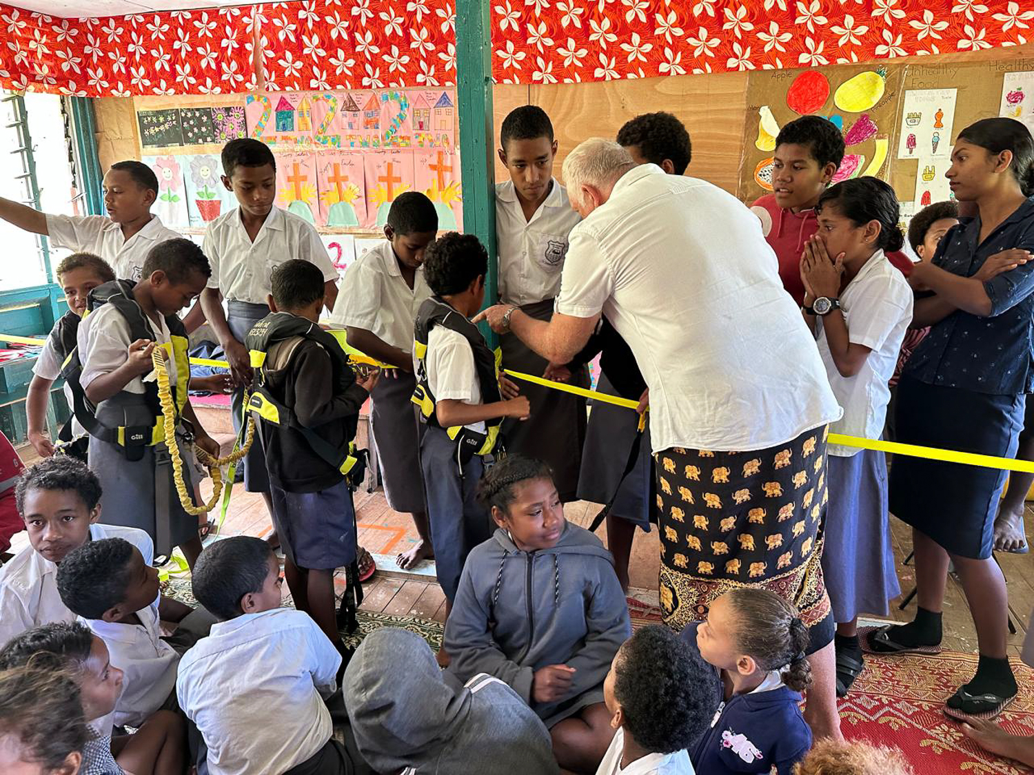 We gave a short presentation showing photos of Taihoa and some of the equipment that keeps us safe (lifejackets and safety lines) and warm and dry (wet weather gear). All of this required demonstration, so there was lots of fun as some were dressed in full wet weather in 35 degrees while others donned lifejackets with double safety lines so that they could safely traverse the classroom clipped onto the jack lines that we had fixed earlier. A short physics lesson was then conducted to explain how the wind didn’t just push us but also pulled us along. Claire and Jonathan then presented their photos showing what the village looked like 35 years ago and the children happily identified various relatives.
