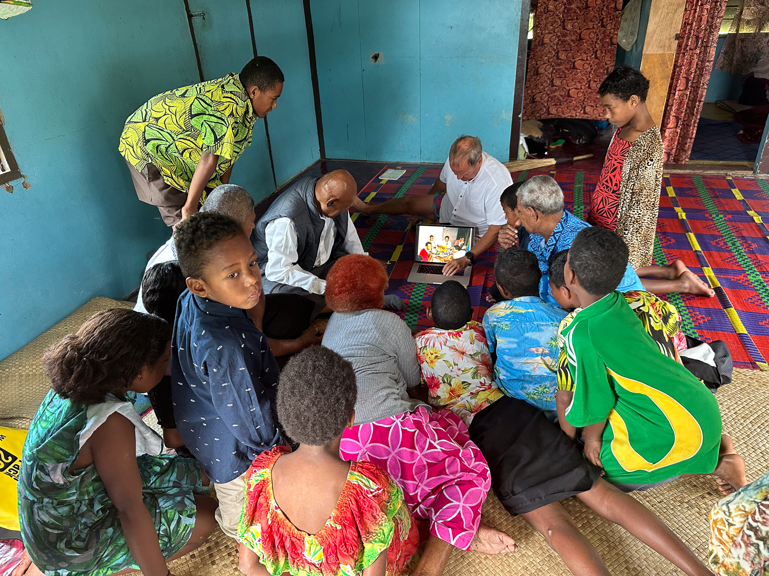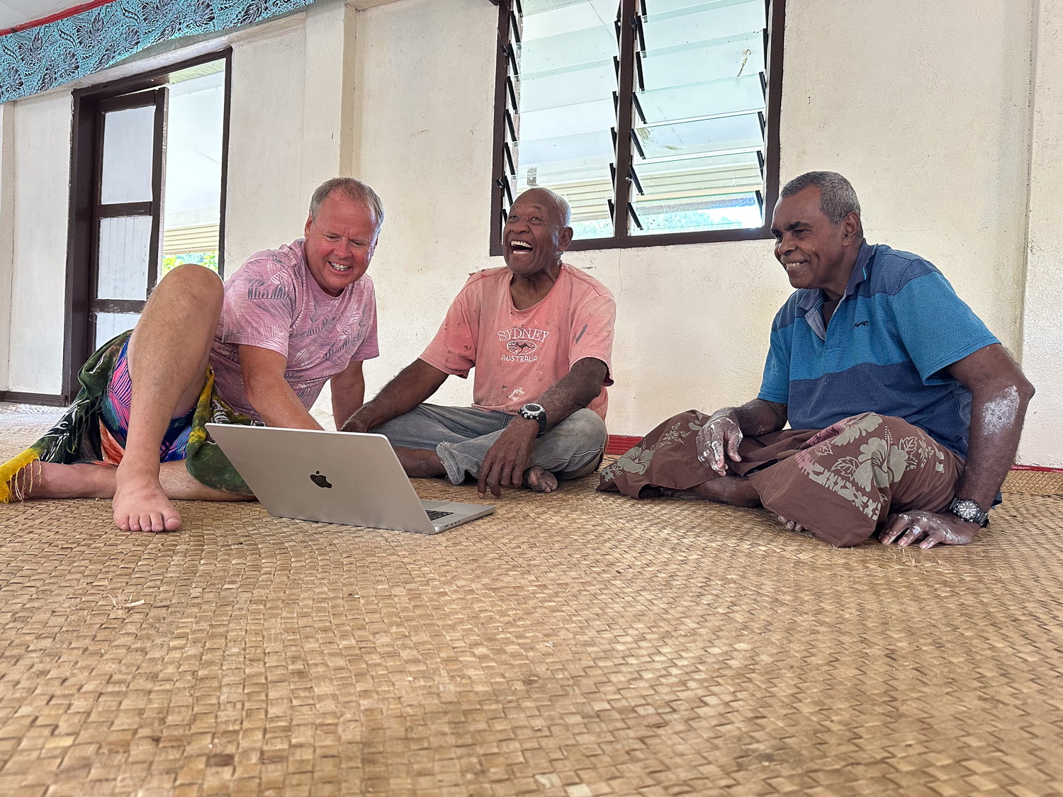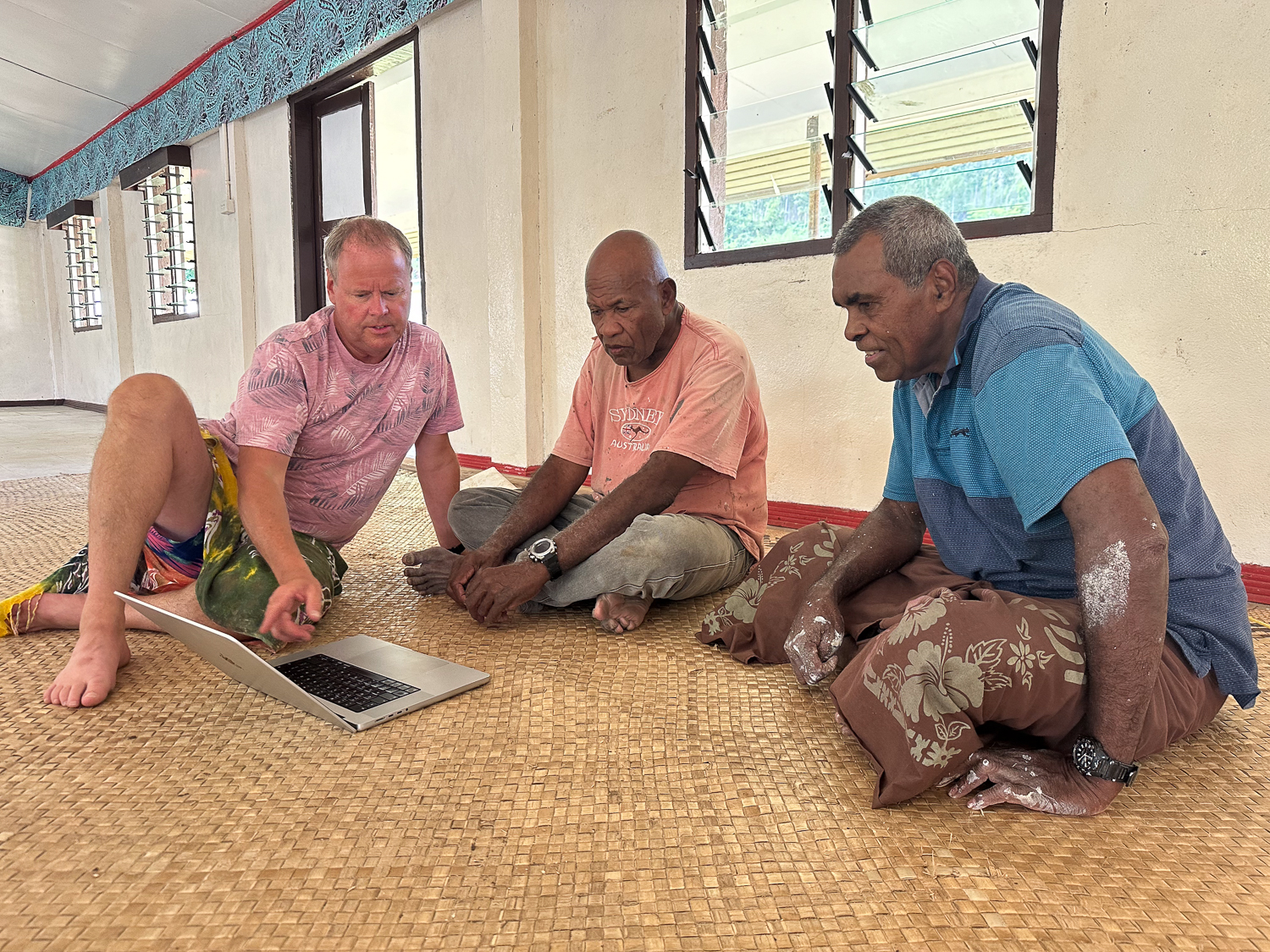 We had the usual friendly reception on the beach and were taken to the chief – Ratu Levu- to hand over our kava gift at the sevusevu ceremony. Formalities complete, Jonathan took out his laptop to show their photos from 1989. Levu, and another man assisting with sevusevu, had not been in the village at the time but were able to identify many of the people in the photographs (many had passed away). We arranged to come to church on Sunday and hopefully meet some of the survivors.