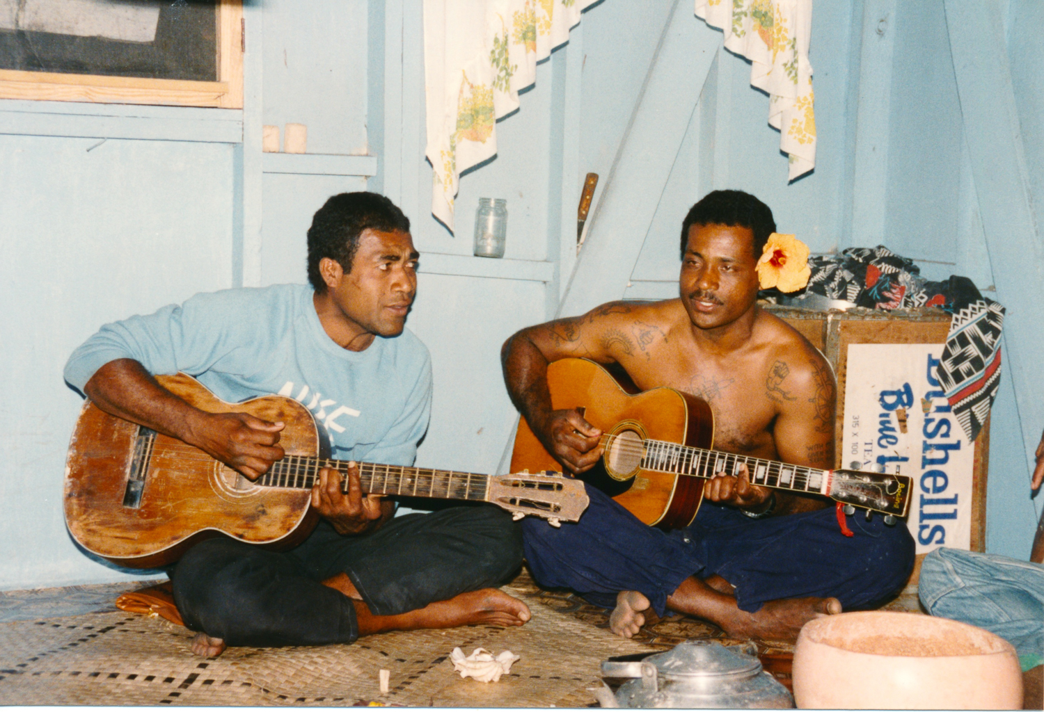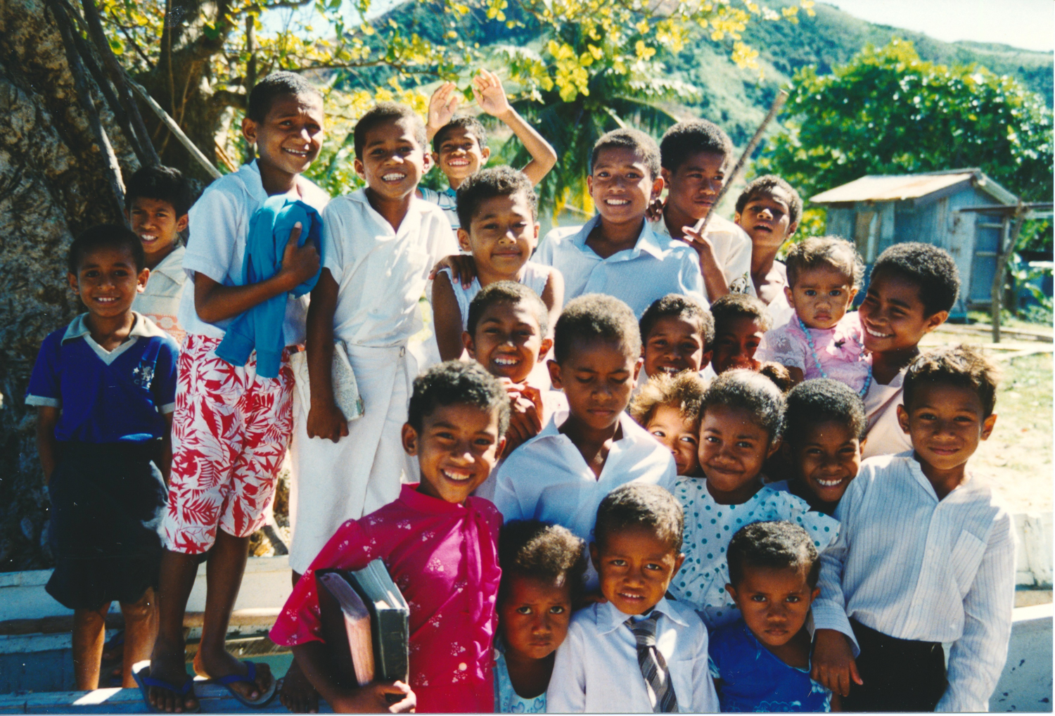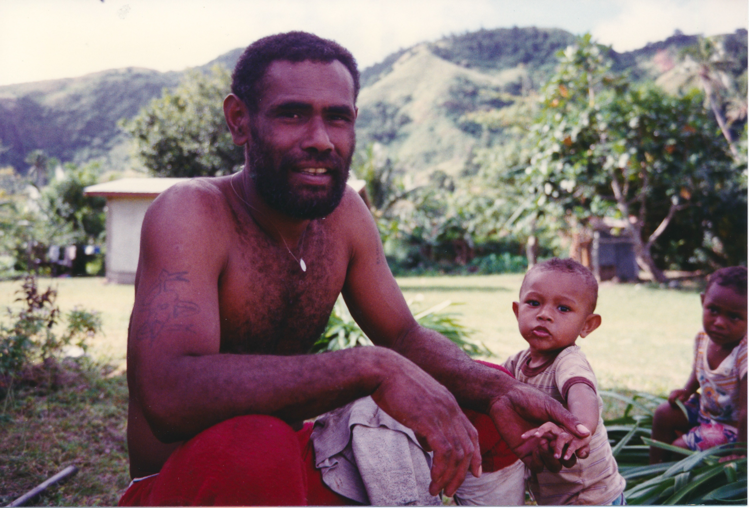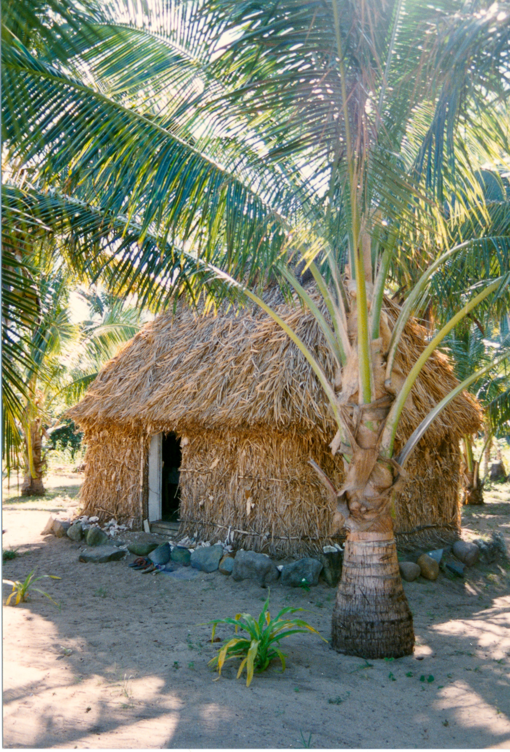 We had the usual friendly reception on the beach and were taken to the chief – Ratu Levu- to hand over our kava gift at the sevusevu ceremony. Formalities complete, Jonathan took out his laptop to show their photos from 1989. Levu, and another man assisting with sevusevu, had not been in the village at the time but were able to identify many of the people in the photographs (many had passed away). We arranged to come to church on Sunday and hopefully meet some of the survivors.