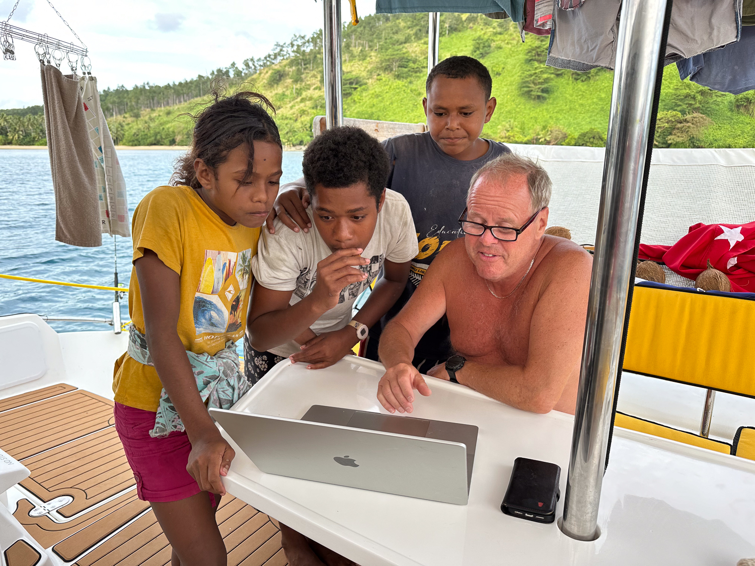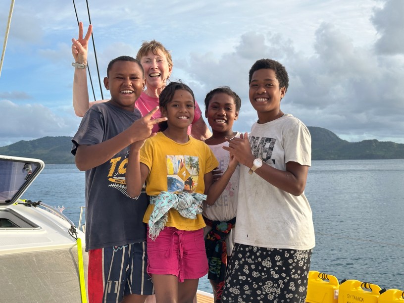 The curious kids wanted to know everything about the boat and were especially impressed with our offering of ginger nuts. Later, when Nigel returned with the boat man he turned out to be just as curious as the children and was delighted to have a tour of the boat. The most impressive piece of equipment, as far as he was concerned, was the water maker. He could be heard telling the children about it as they all climbed into his boat to return to the village.