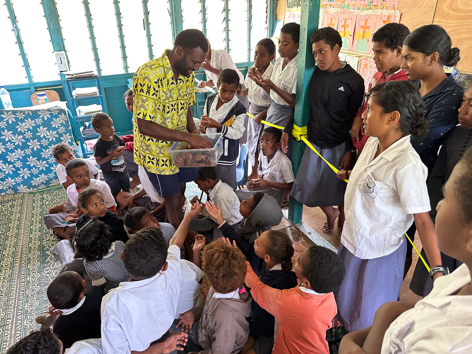 Not a problem. It was all reminiscent of yesterday’s church service. The fact that there was no priest did not phase the congregation and the fact that there were no teachers did not phase these children. We were warmly welcomed and invited into a classroom. We were given chairs (infant school size) to sit on (a big improvement from church) and asked to introduce ourselves. We did as requested and then the children sang us a welcome song (in Fijian) and proceeded to introduce themselves (in English) telling us their names, their age and what they wanted to do when they left school.