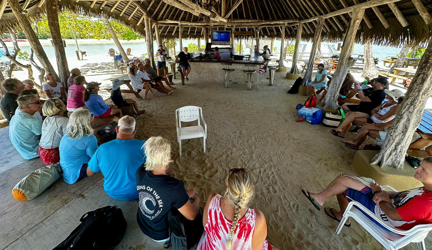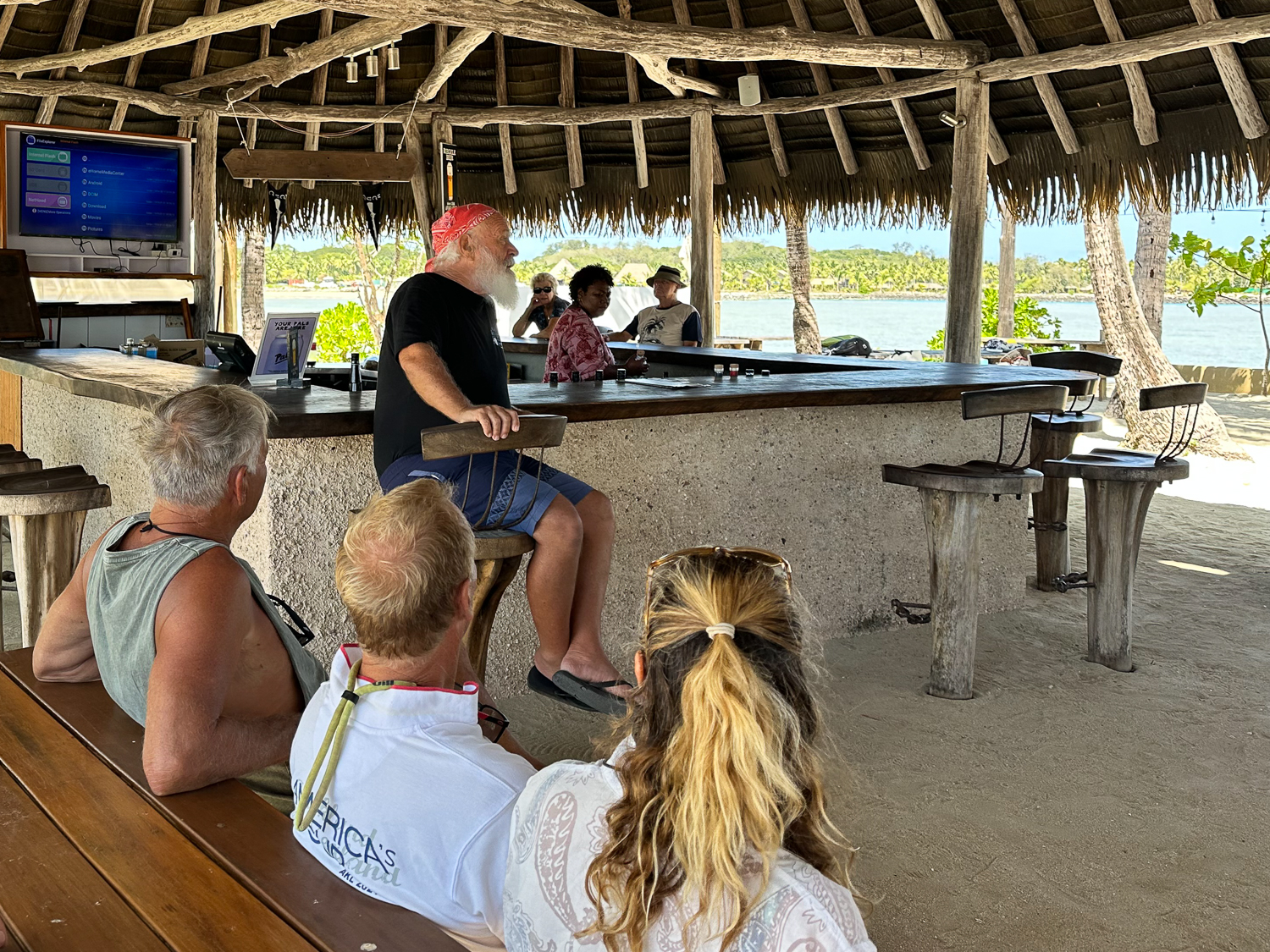 Erin Bomati was instrumental in linking the group with the Island Cruising rally. We first met her in Taurikura when she came on board Taihoa to show us how to use the ‘torpedo’, the sample collecting device that we tow behind us for a few minutes each day while on passage. We met her and husband Bruno when we arrived at Nawi Marina many weeks ago and handed over our samples from the passage to Fiji. It was great to catch up again at Musket Cove. Erin had helped put together a two day mini conference for the 25 yachts involved in this first full scale trial of the sampling process.