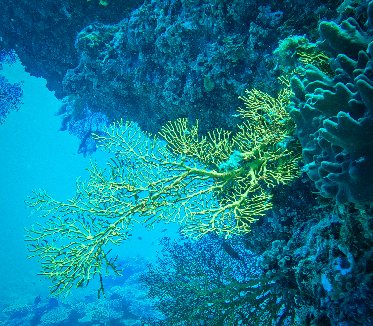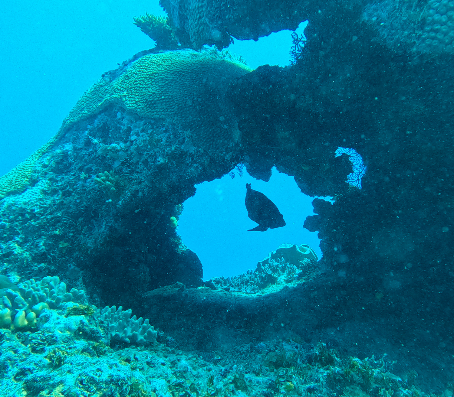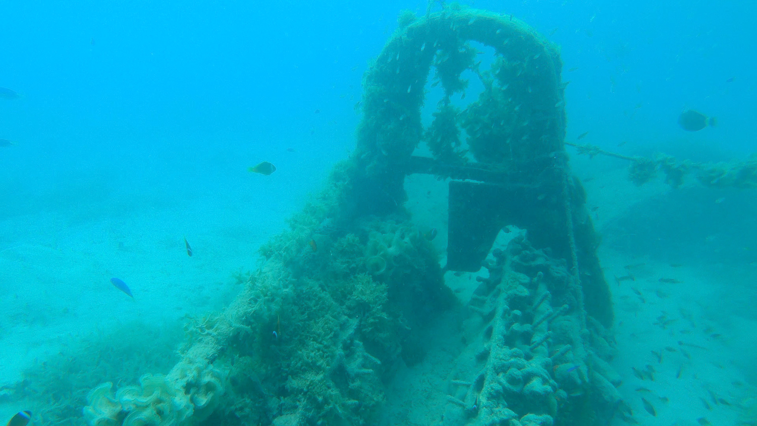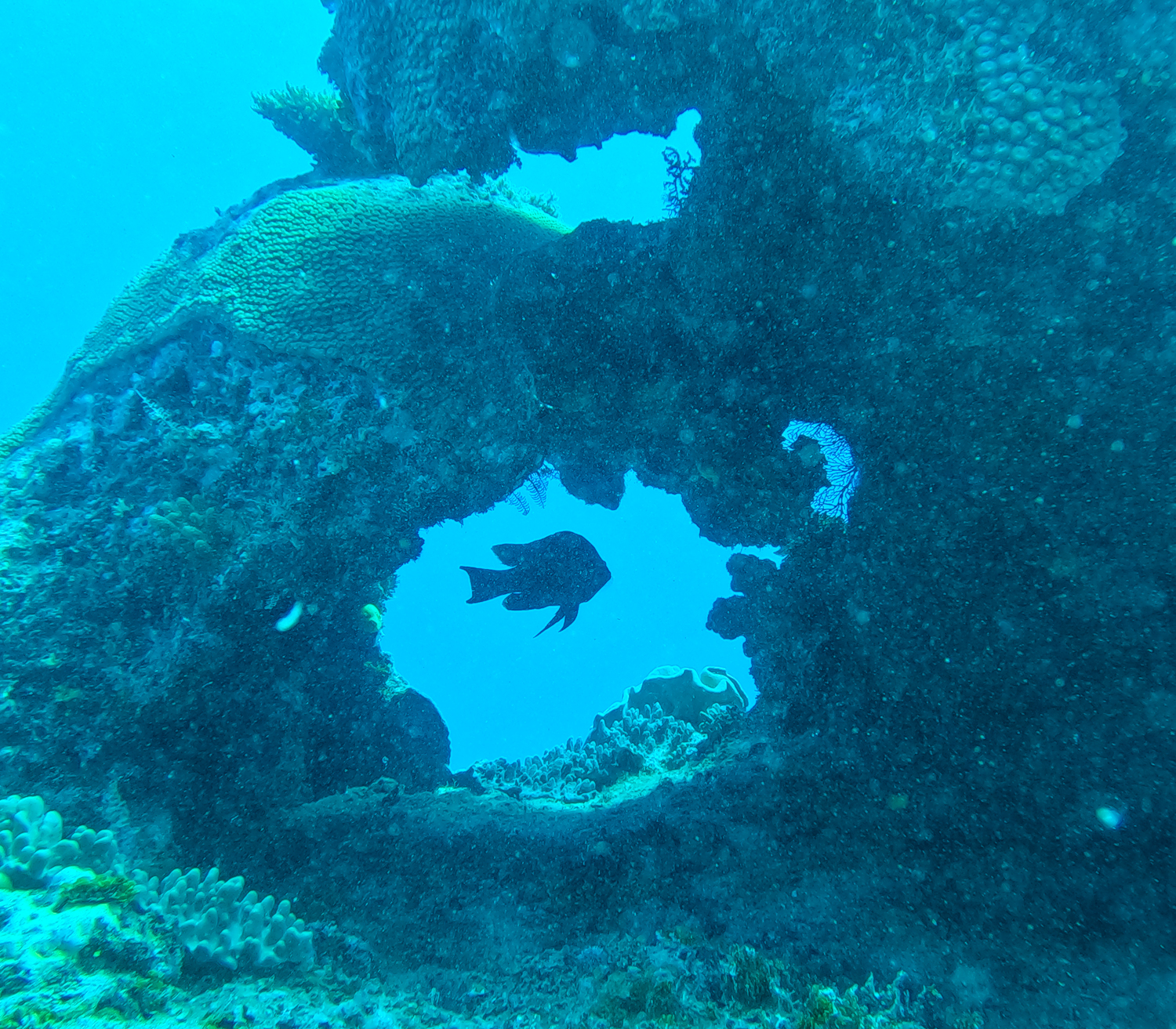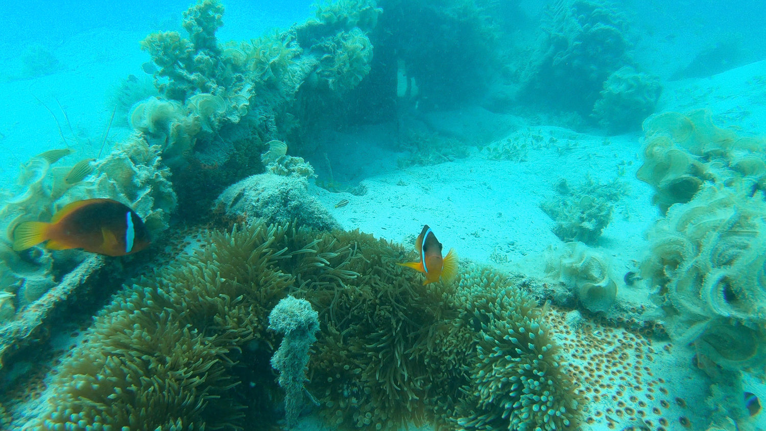 A totally unspectacular wreck. Not sure what we really expected but what we got was an engine with a tiny bit of fuselage. As a consolation, a number of clown fish had made it their home. The coral back in One Dollar Bay was far more interesting. At least we got a walk.