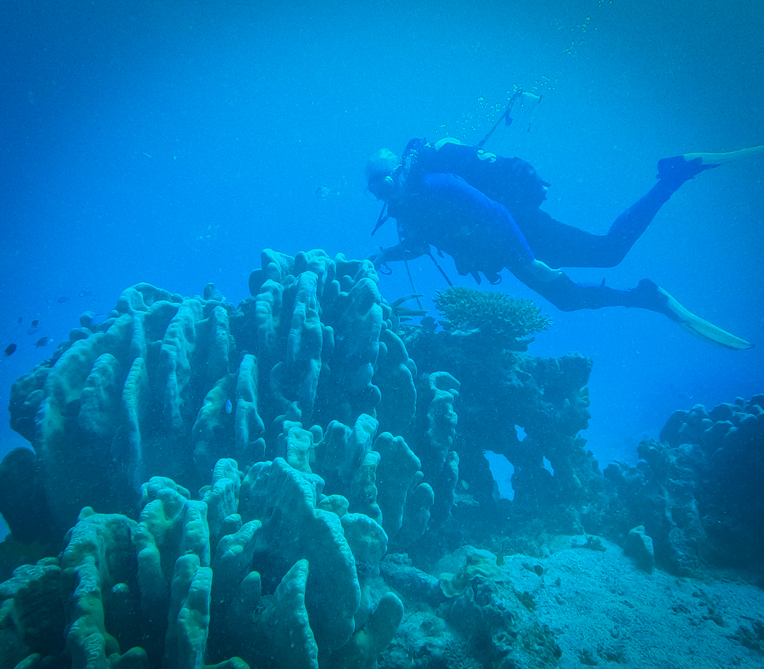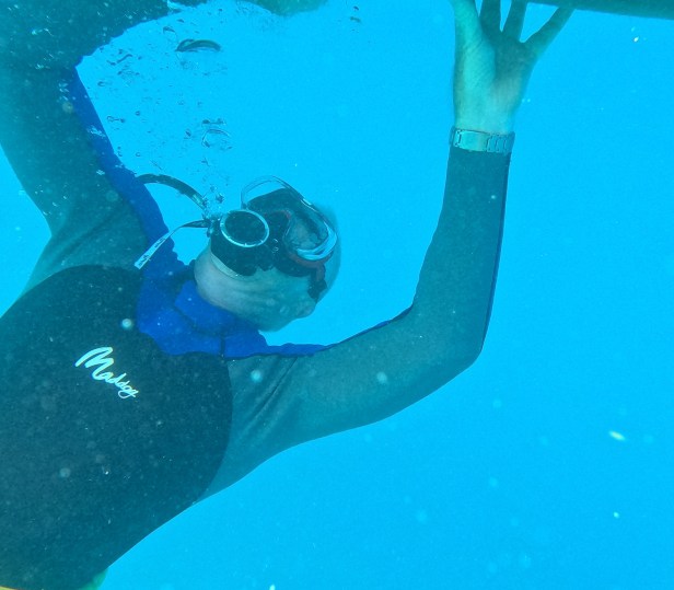 Our charts gave no indication of 30m depths anywhere near the island so we began to seriously doubt the information from Paul. Anyhow, we were committed to diving there. Claire and Jonathan went in first. They were underwater for about an hour and surfaced with grins like Cheshire cats. No sign of crayfish, but they had experienced the most beautiful scenic dive amongst fabulous coral formations. Sue and Nigel followed and also had an amazing dive experience. It was astonishingly beautiful.