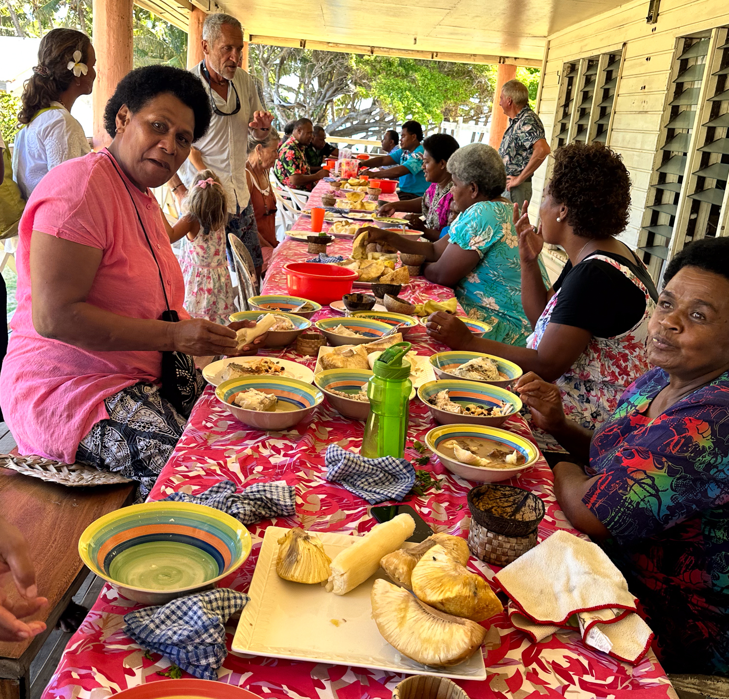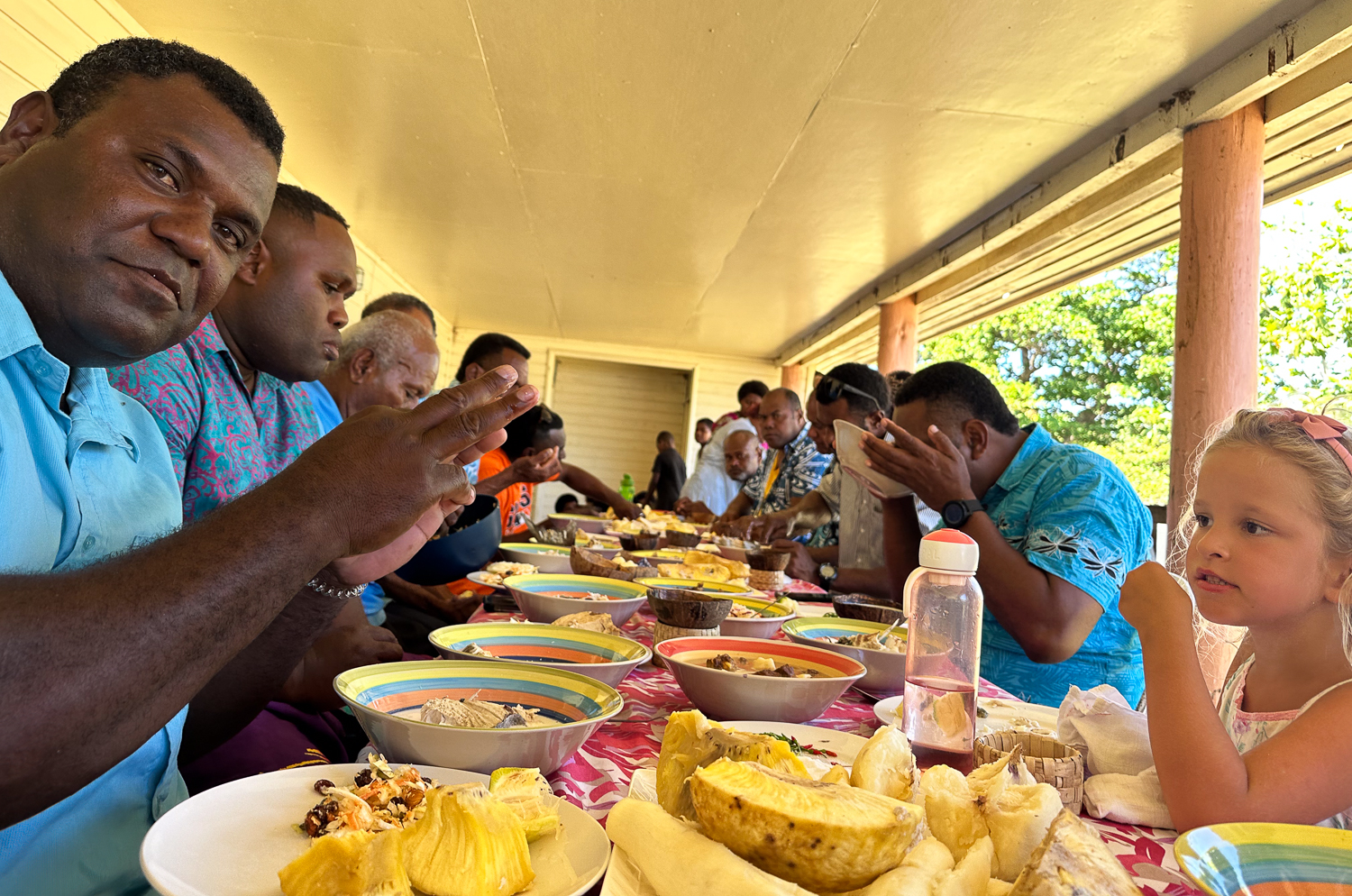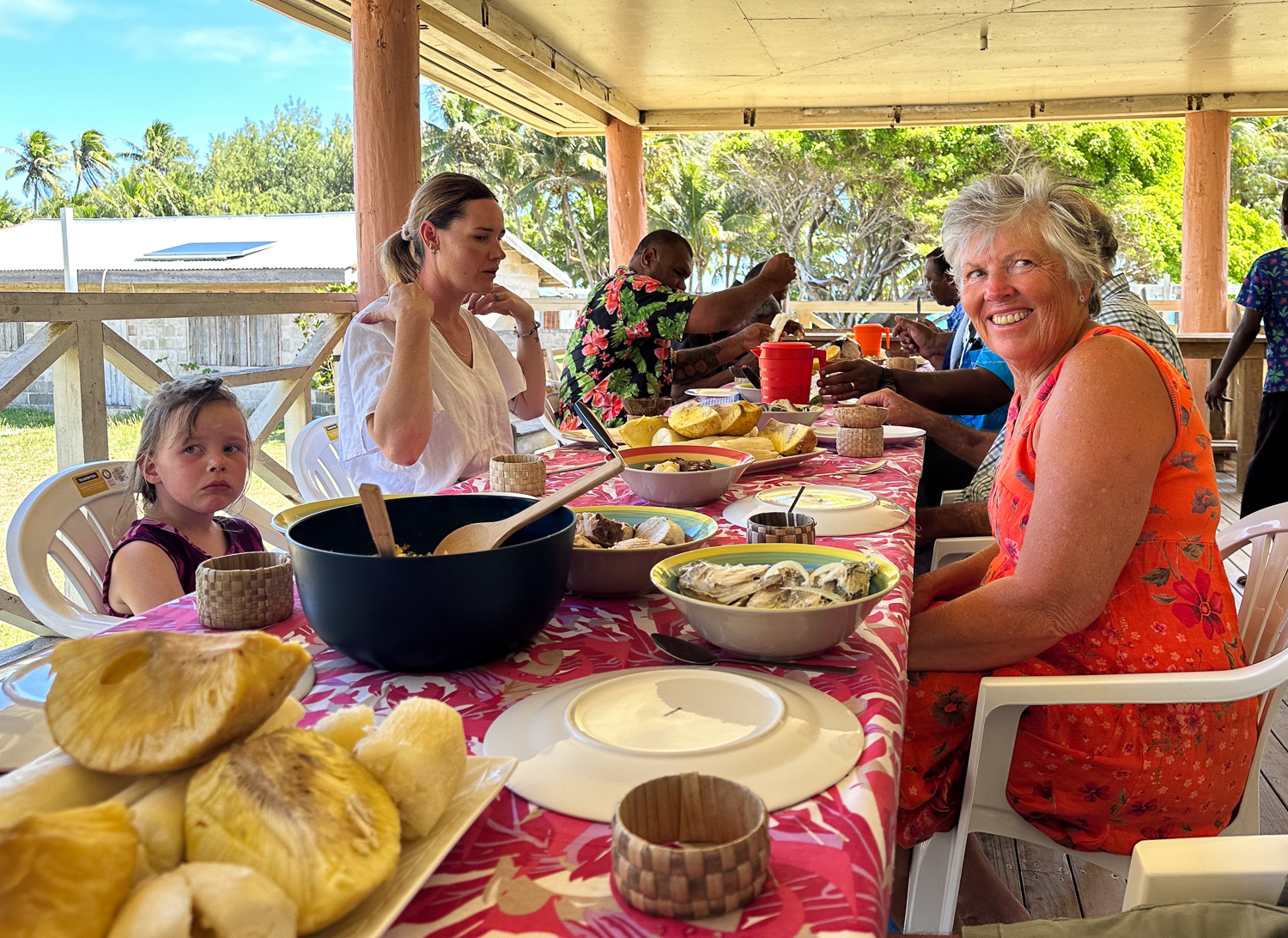After a day spent snorkelling and cleaning hulls, we ventured ashore. A group of children welcomed us and led us to the beach front home of Va and Ben. It felt as though several families were involved in this venture. A number of women and even more children sat around a table that was laden with all kinds of local foods.