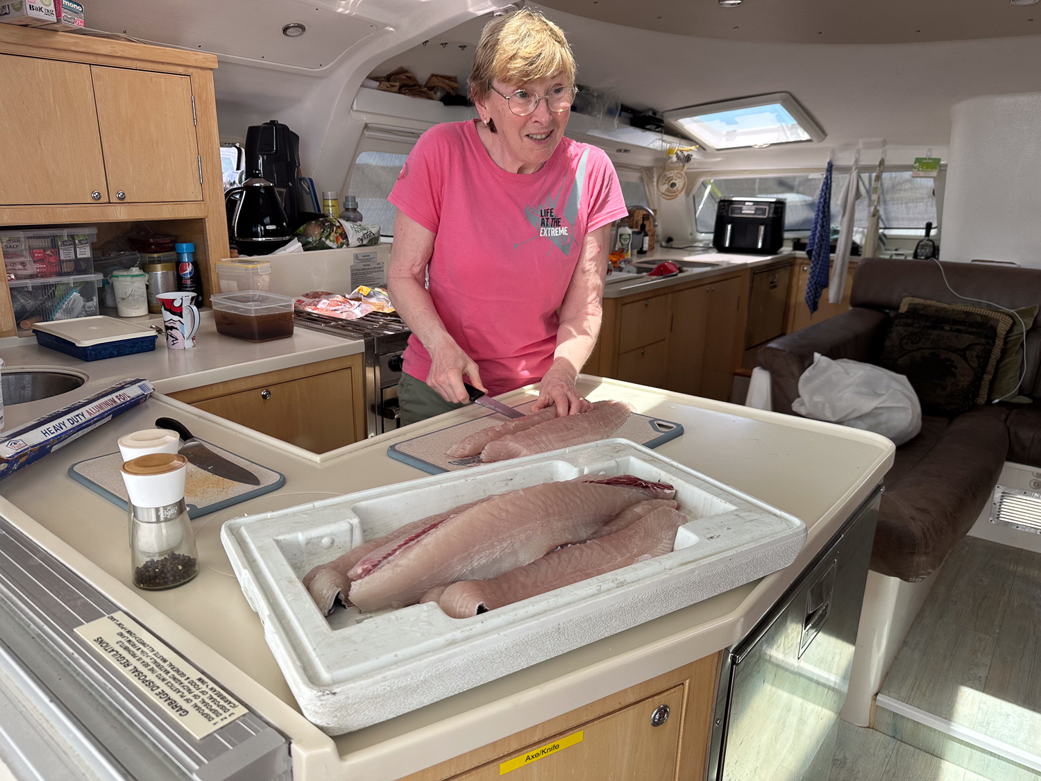 The gentle sail back to Mana Island took most of the day. We were almost there when the wind dropped to nothing and we had to motor. On arrival we finally took a trip ashore and much to our delight not only found a beach front bar but also a lady willing to sell us some fruit and vegetables including cassava. At last cassava chips for dinner! To make it even better, Sue had landed a Spanish mackerel on passage so we were having fresh fish and chips.