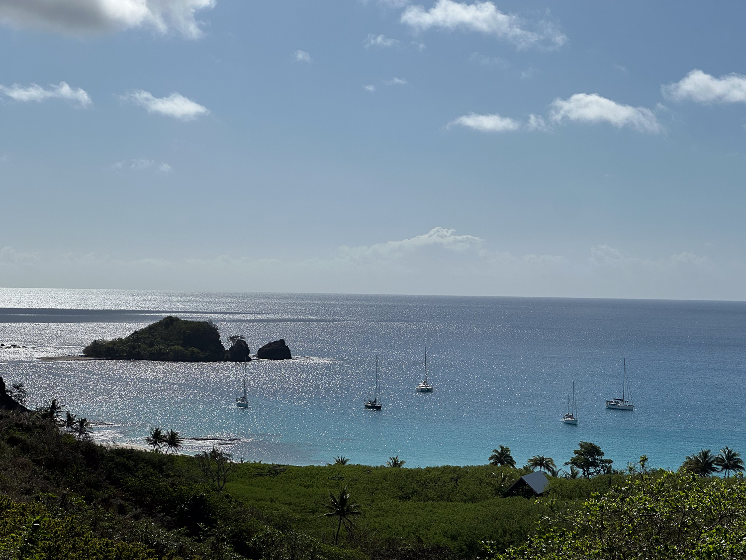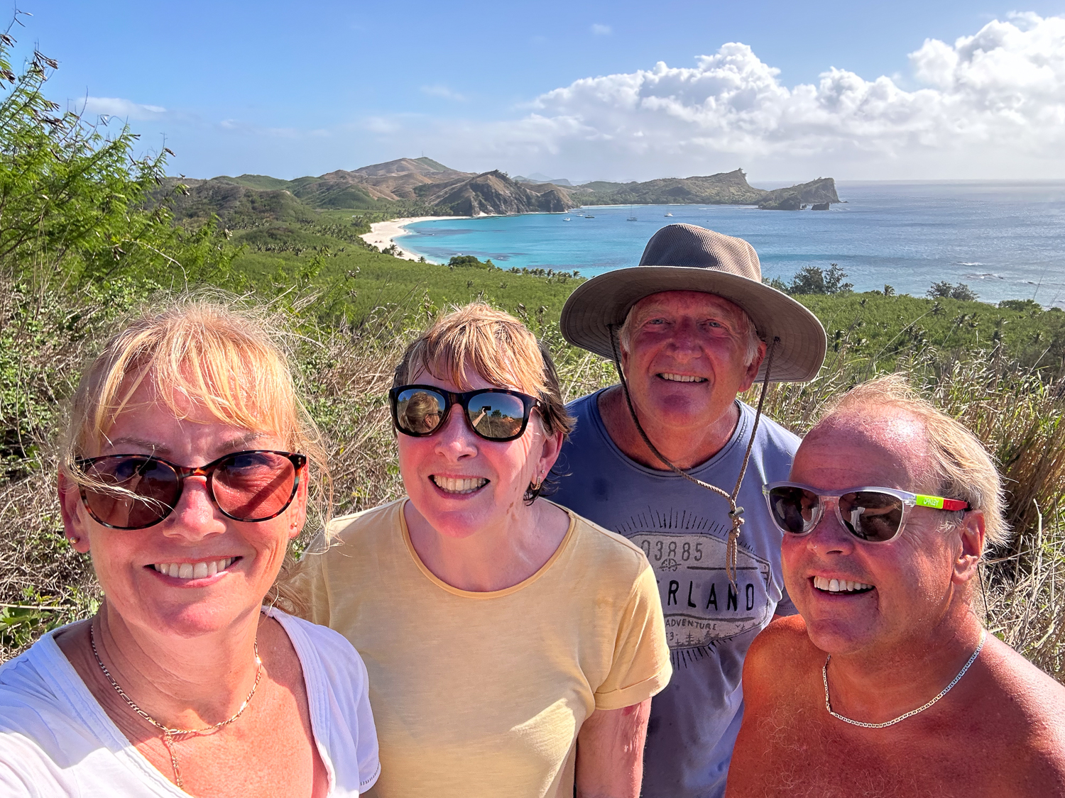 Gifting done, we made the short trip across the bay to Champagne Beach. A beautiful sheltered beach whose sand was supposed to resemble pink champagne. Sundowners on the pink champagne beach with everyone that we had met earlier along with Daryl and Carol from Scoots.