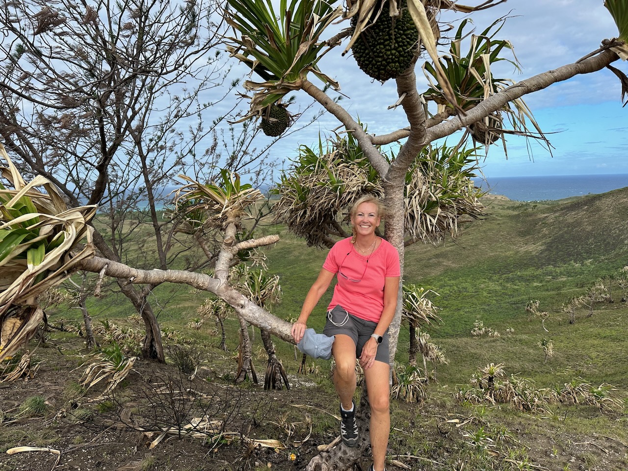 Sue was not feeling great so Nigel, Jonathan and Claire landed in a pretty sandy bay and set of on a one and a half kilometre hike over the island, carrying masks, fins and snorkels, through a variety of grass, scrub and coconut palms.