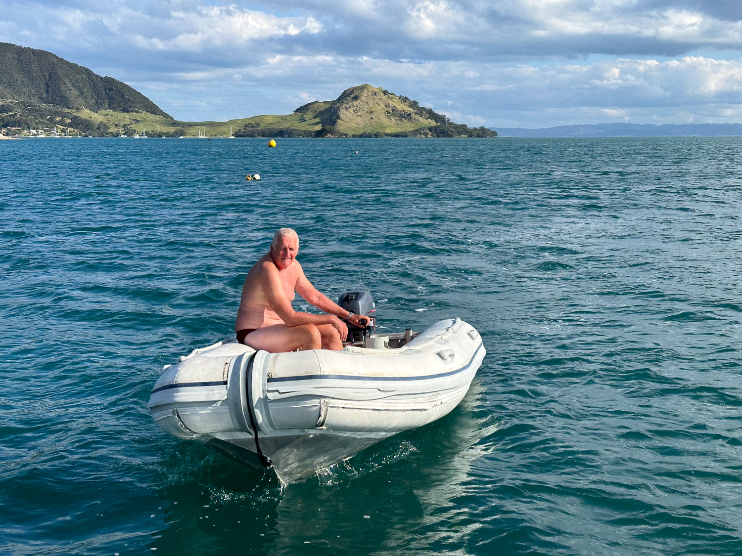Nigel failed to secure the dinghy after lowering it from the davits. A strong northerly breeze meant that it wasted no time in setting off on its own with Nigel, stripped to his undies, swimming in pursuit.