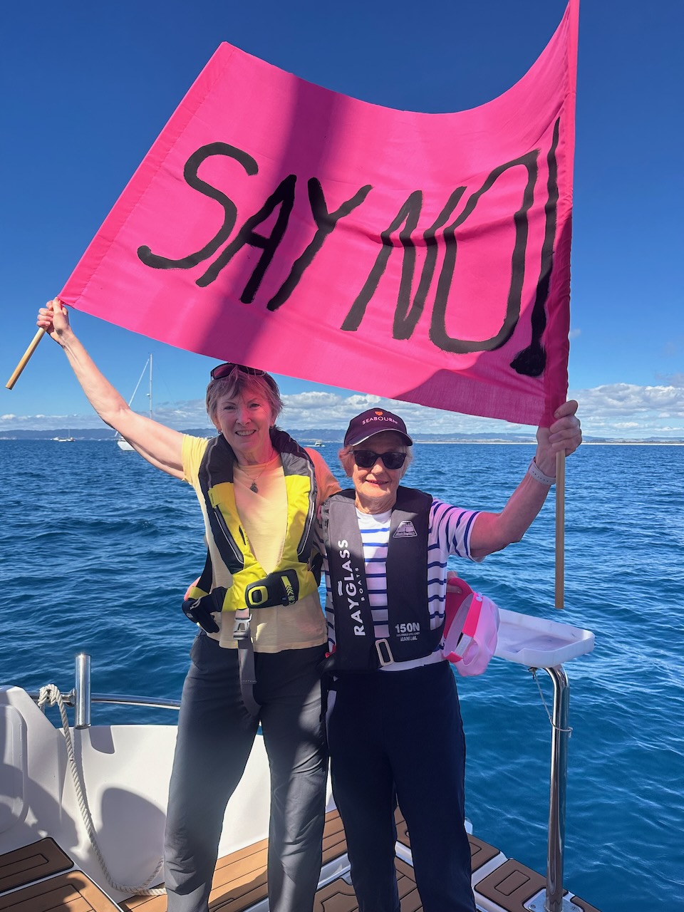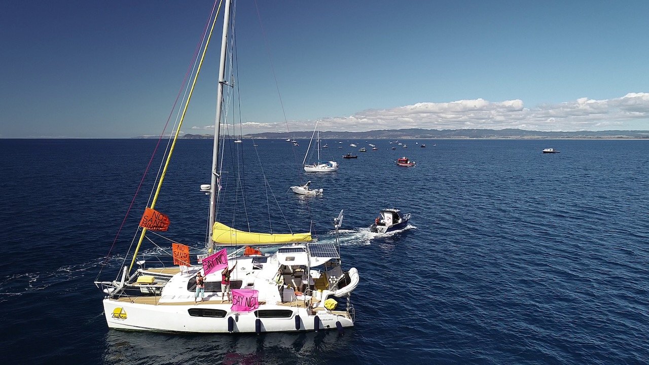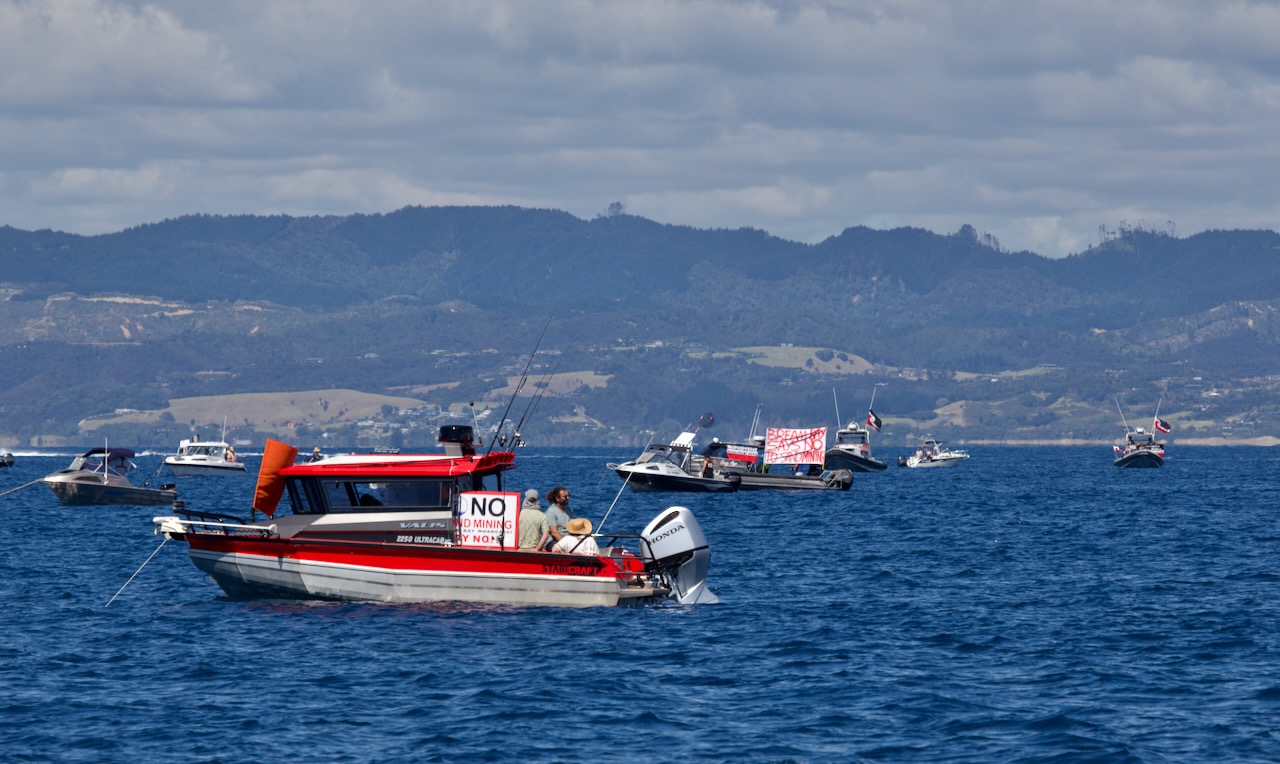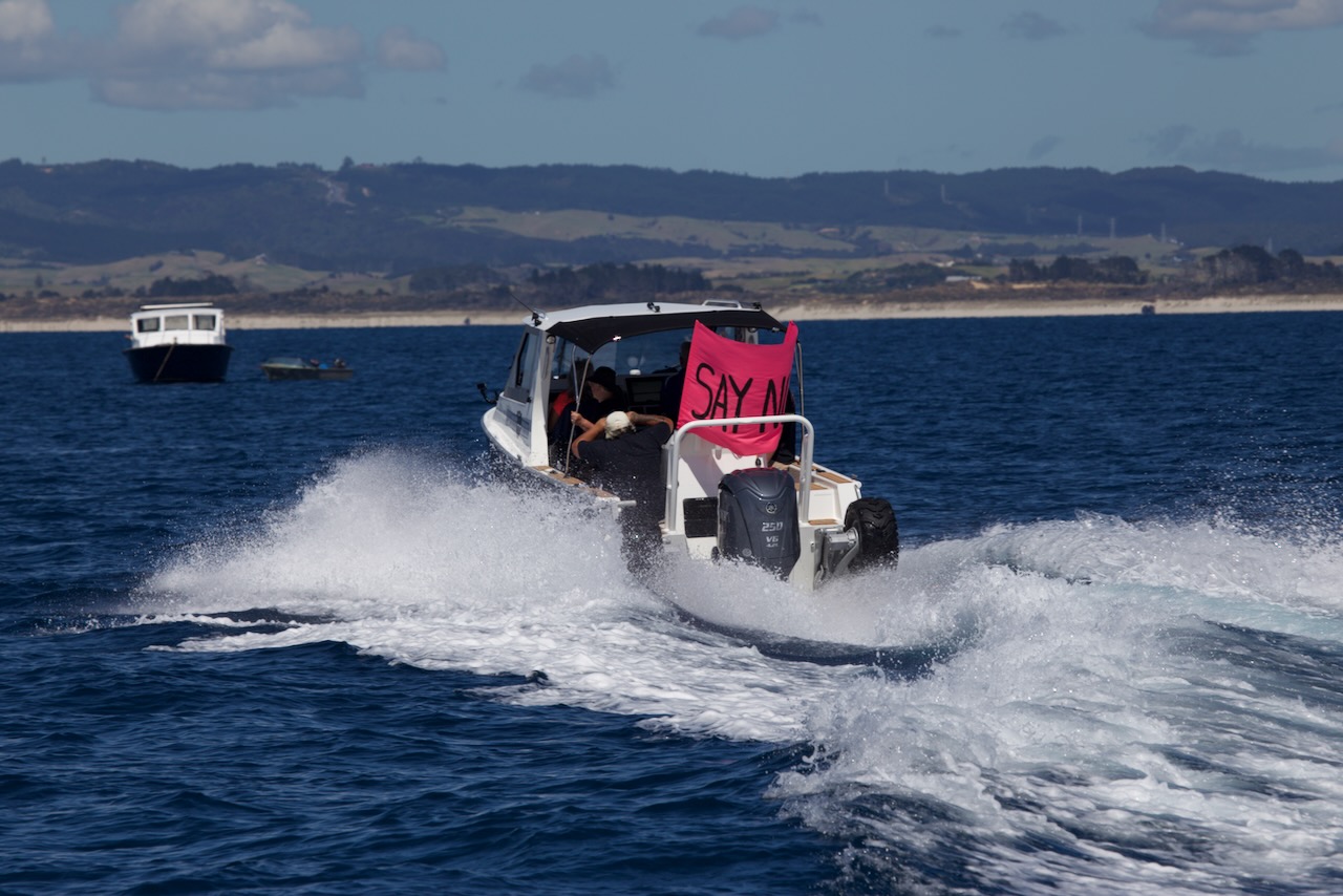 Our next protest took place out on the water with Taihoa acting as the coordinating vessel attempting to get a line up of boats to show exactly where the mining will take place.