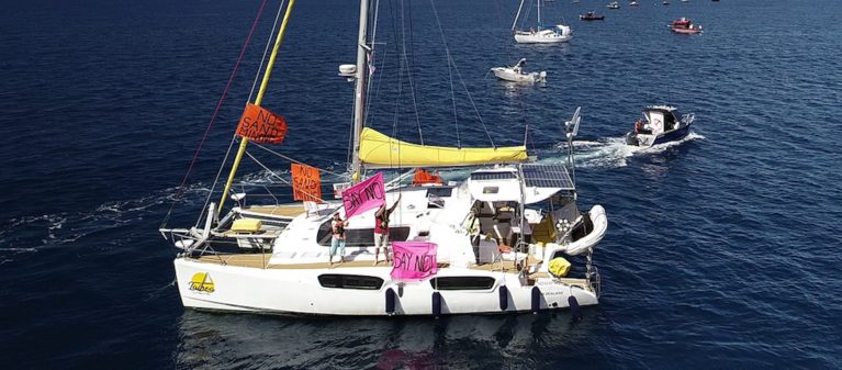 Our next protest took place out on the water with Taihoa acting as the coordinating vessel attempting to get a line up of boats to show exactly where the mining will take place.