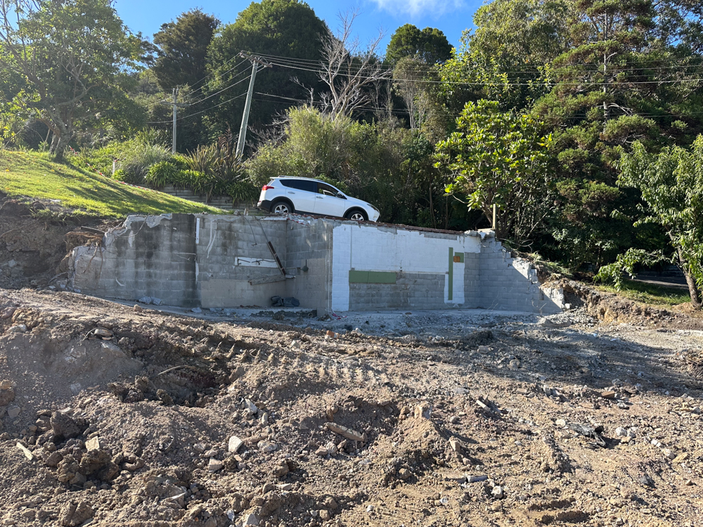 The back wall of the garage had to stay as it helps retain the driveway above it. You can see the power pole leaning at a crazy angle indicating how the ground has slipped below the road.