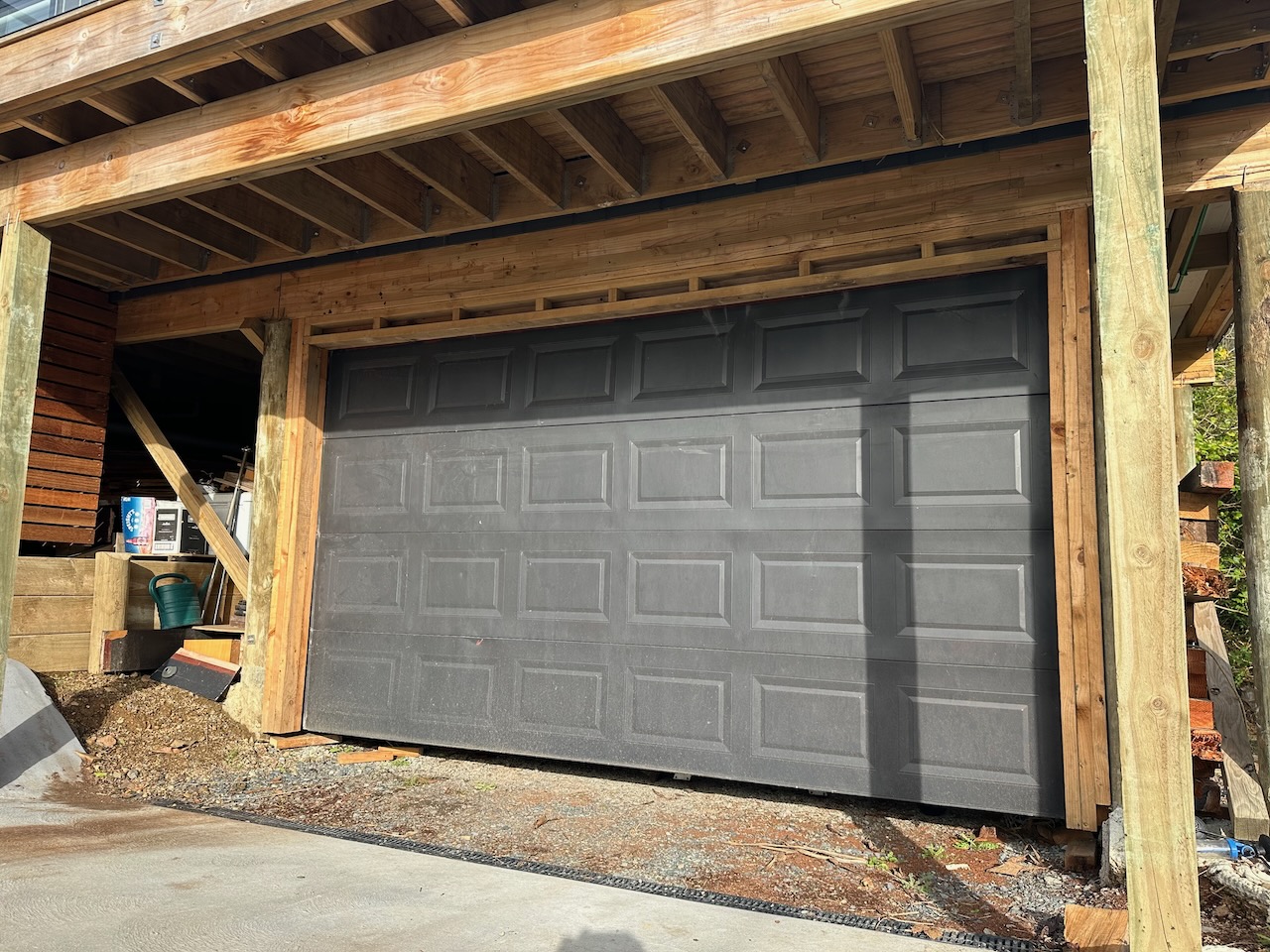 The garage door was a perfect fit for Daniels’ place. Now he just needs to concrete the floor and build some walls.