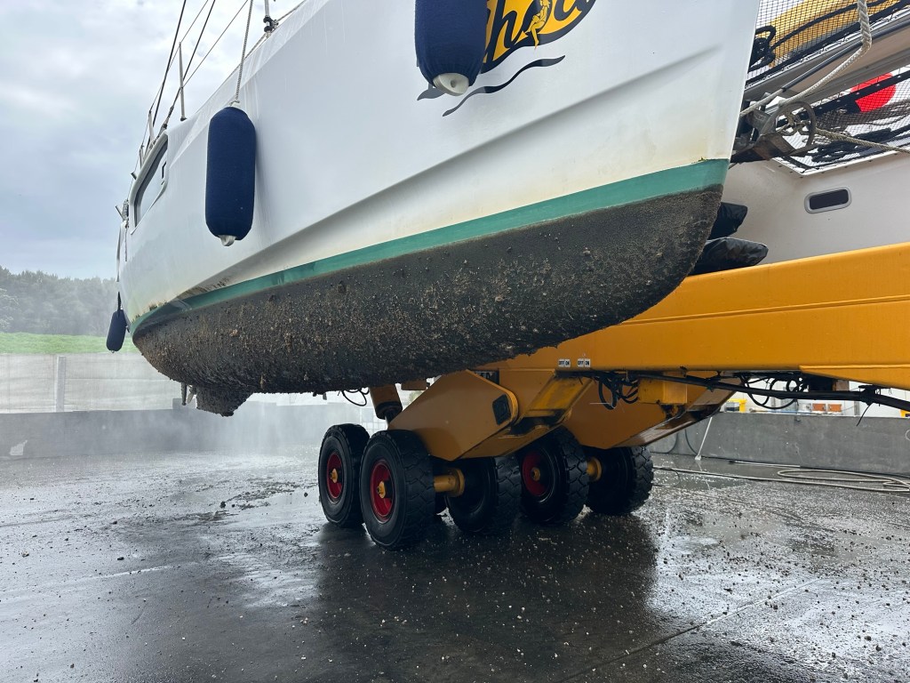 Haul-out was booked for 11am on 30th September at Marsden Cove. This is on the other side of the harbour from us and involves an 80 minute drive each way but only a 15 minute trip in the dinghy, when the weather permits. We have confidence in the company’s operating out of this yard and so it is our preferred haul-out facility.