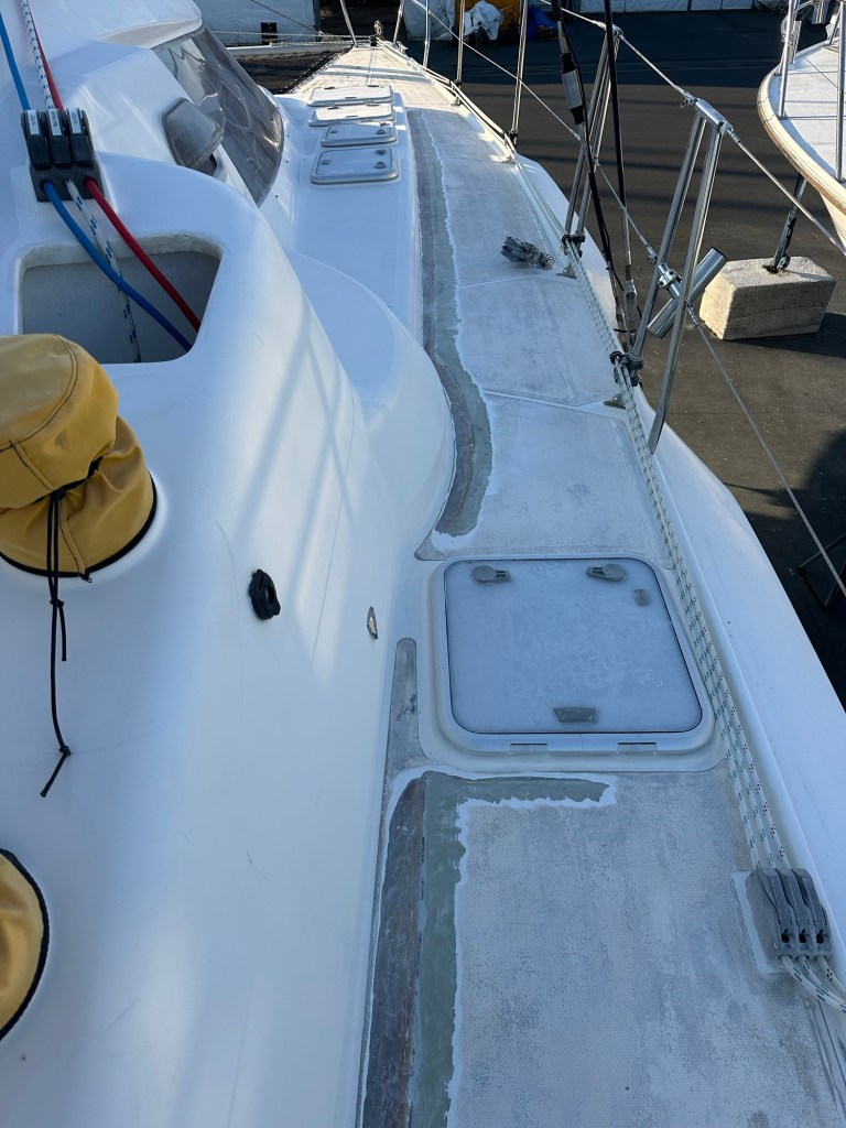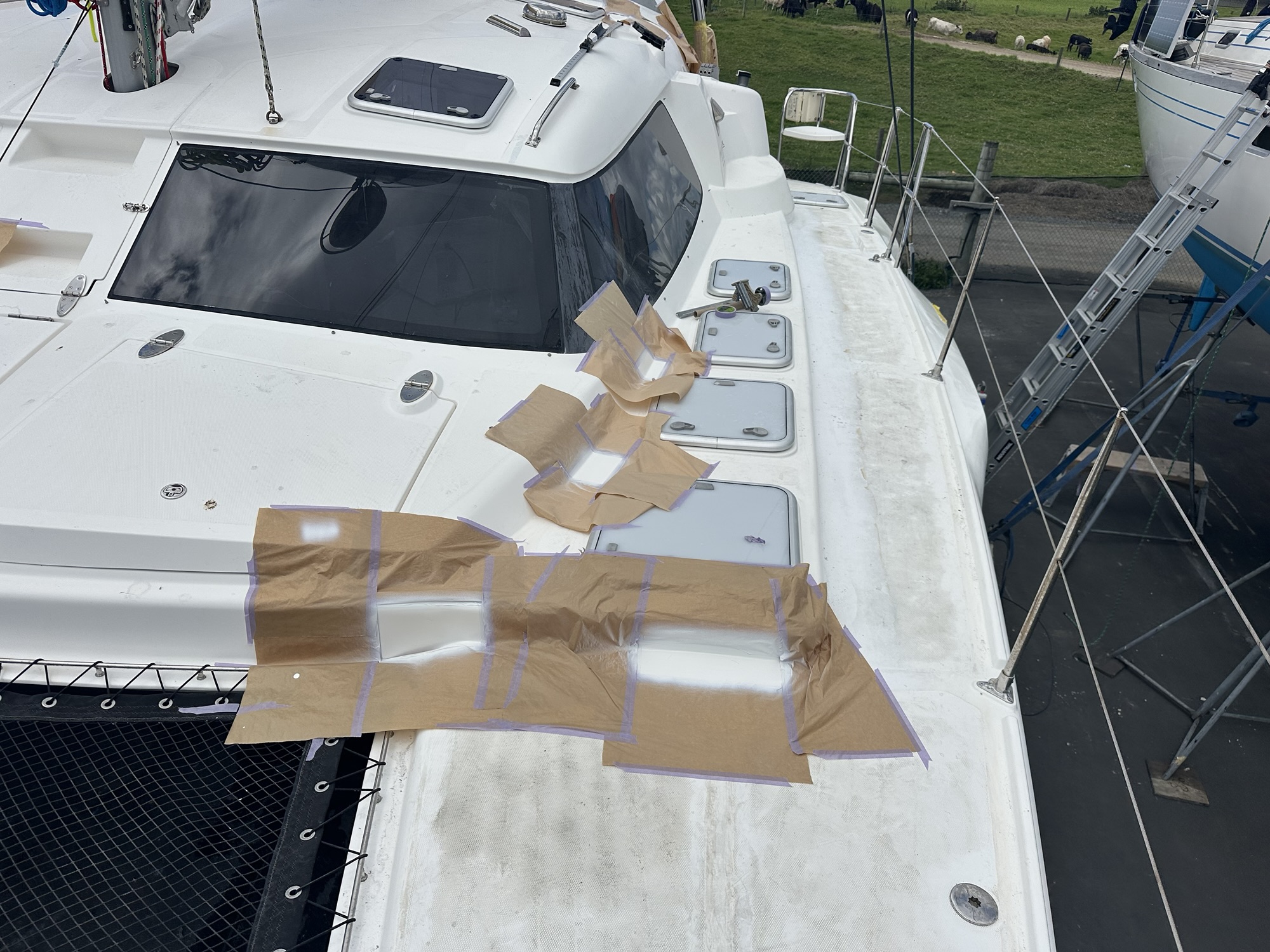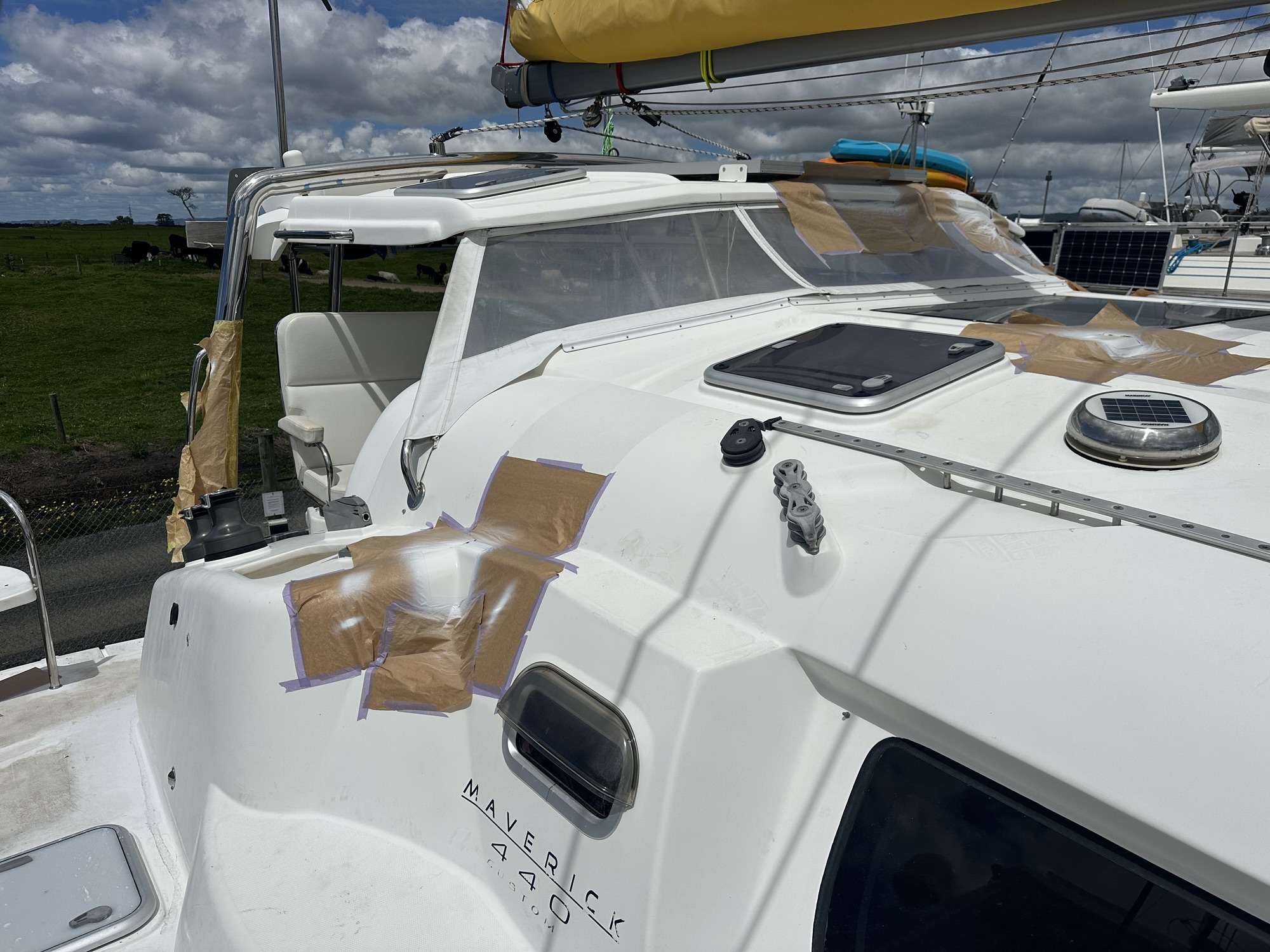 The first issue that lifting the U-deck revealed was a line of cracks where the cabin top joined the decks. We contacted Rudi, the ever helpful owner of Maverick Yachts, who was able to confirm that it was only cosmetic. Just to be sure and to prevent the cracks from worsening we asked Brent from Abel Marine to fix it professionally.