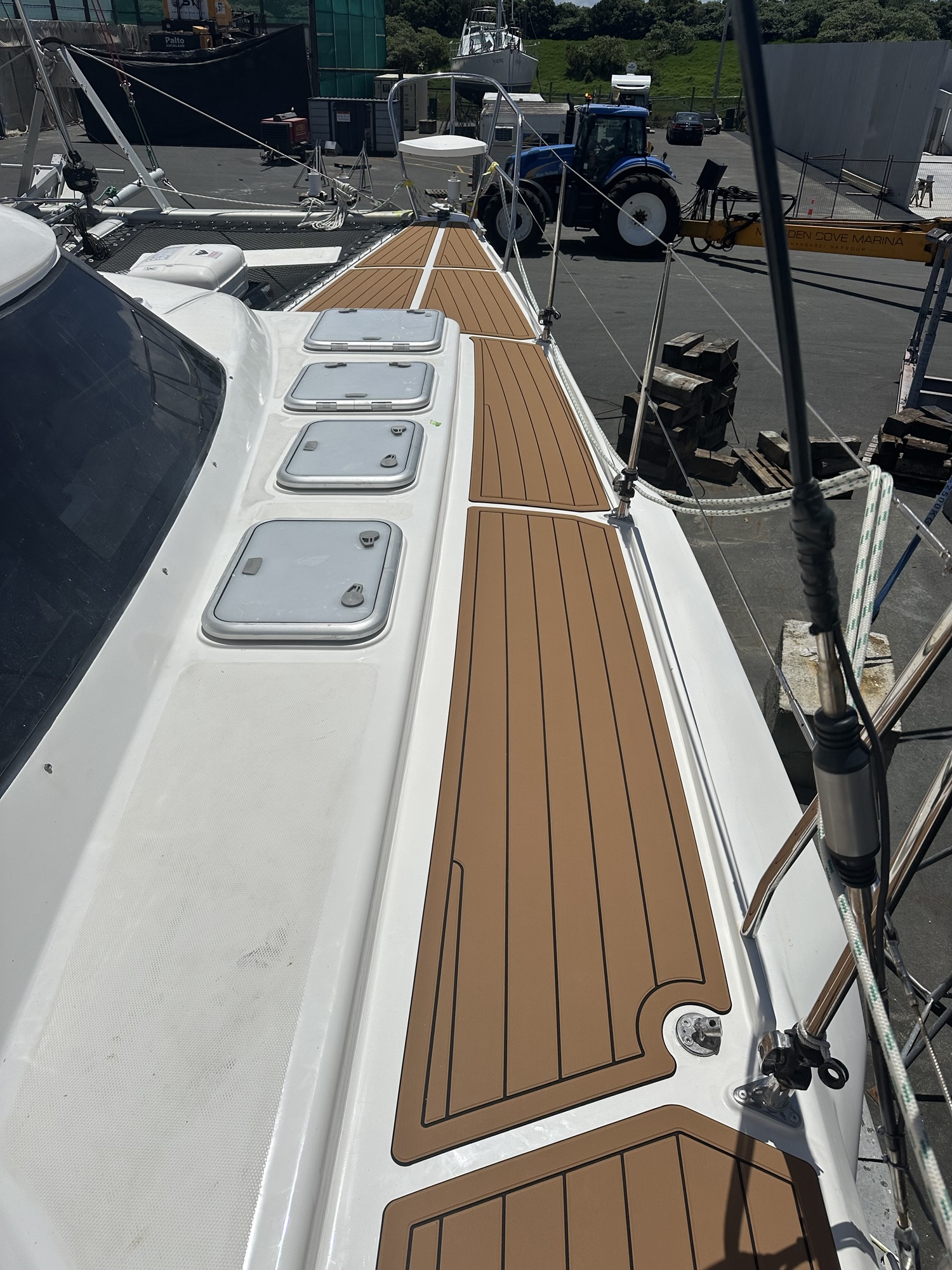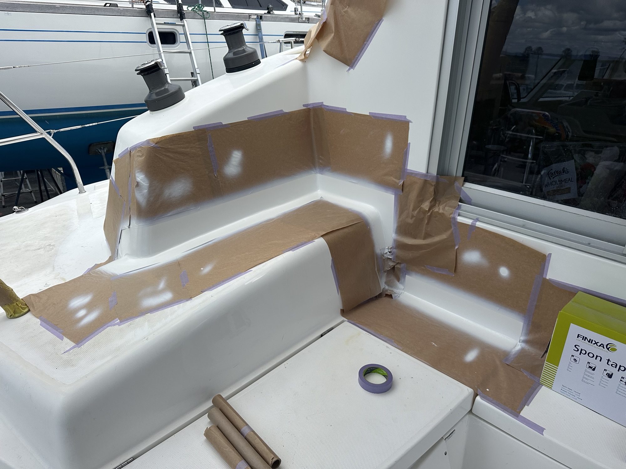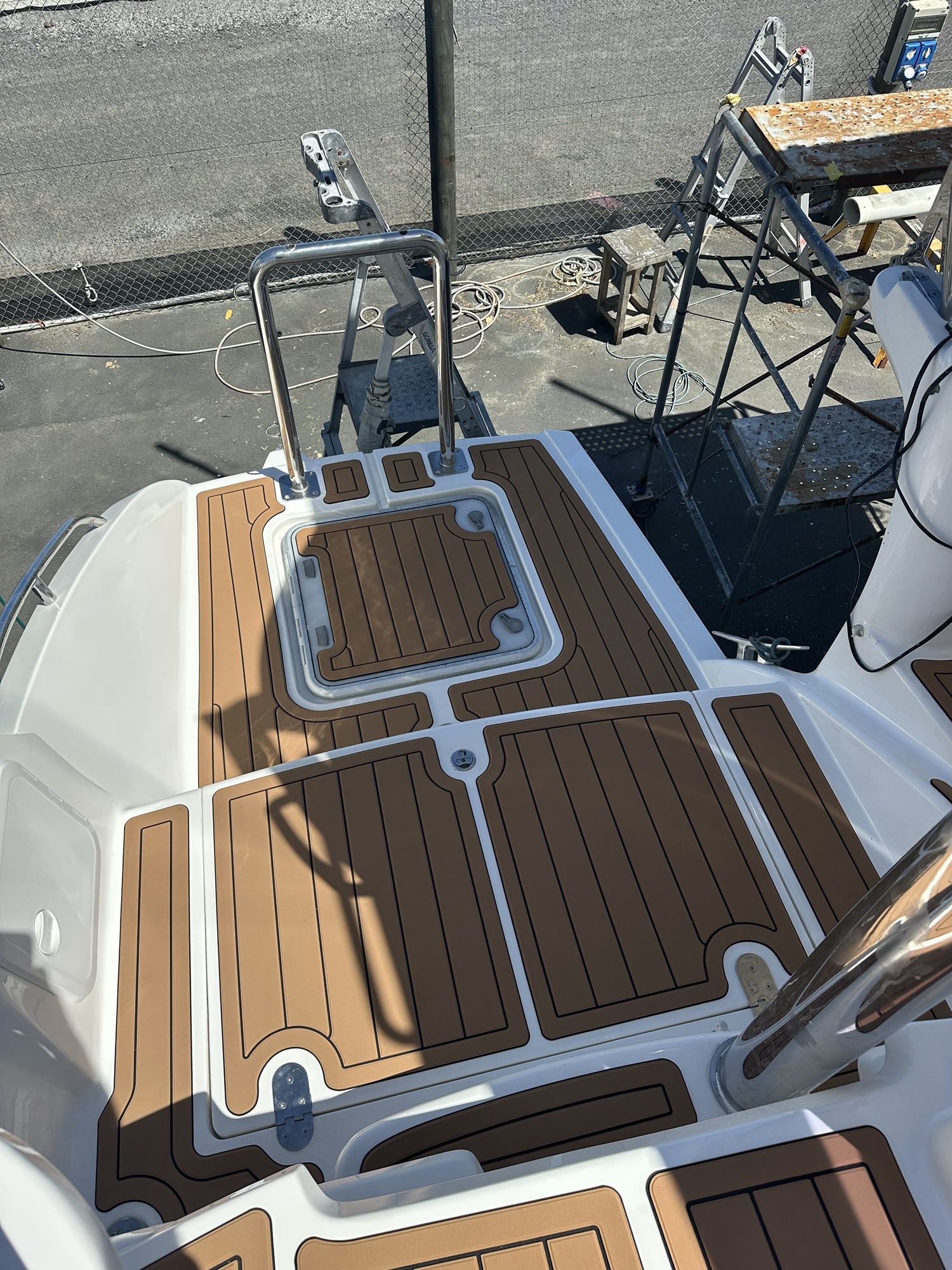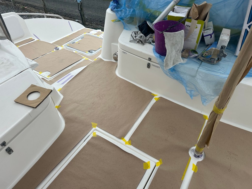 With all the gelcoat work complete we were ready for a dry run install of the U-deck. This involved putting paper templates in place to make sure everything fitted. It was well worth doing, even though there were nearly 70 seperate pieces. We spotted a few errors and Sue made new templates for Brendan and his team to cut out.
