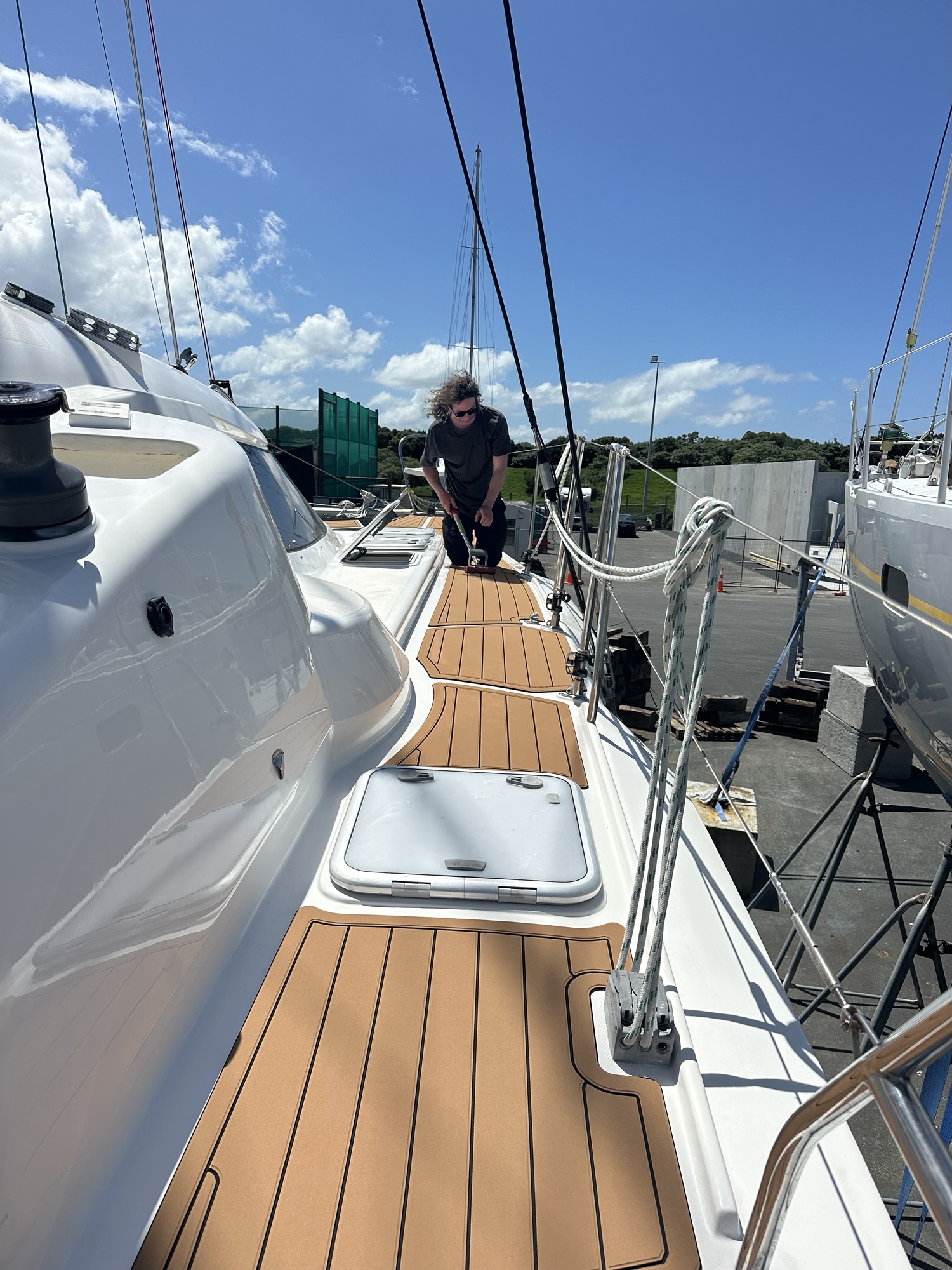 Monday morning saw the Abel Marine team scuffing the Coppercoat to reactivate it ( we missed this stage after our last haul out before going to Fiji and believe that is why we have had so much growth) ready for Remi and the Marsden Cove team to put us back in the water.