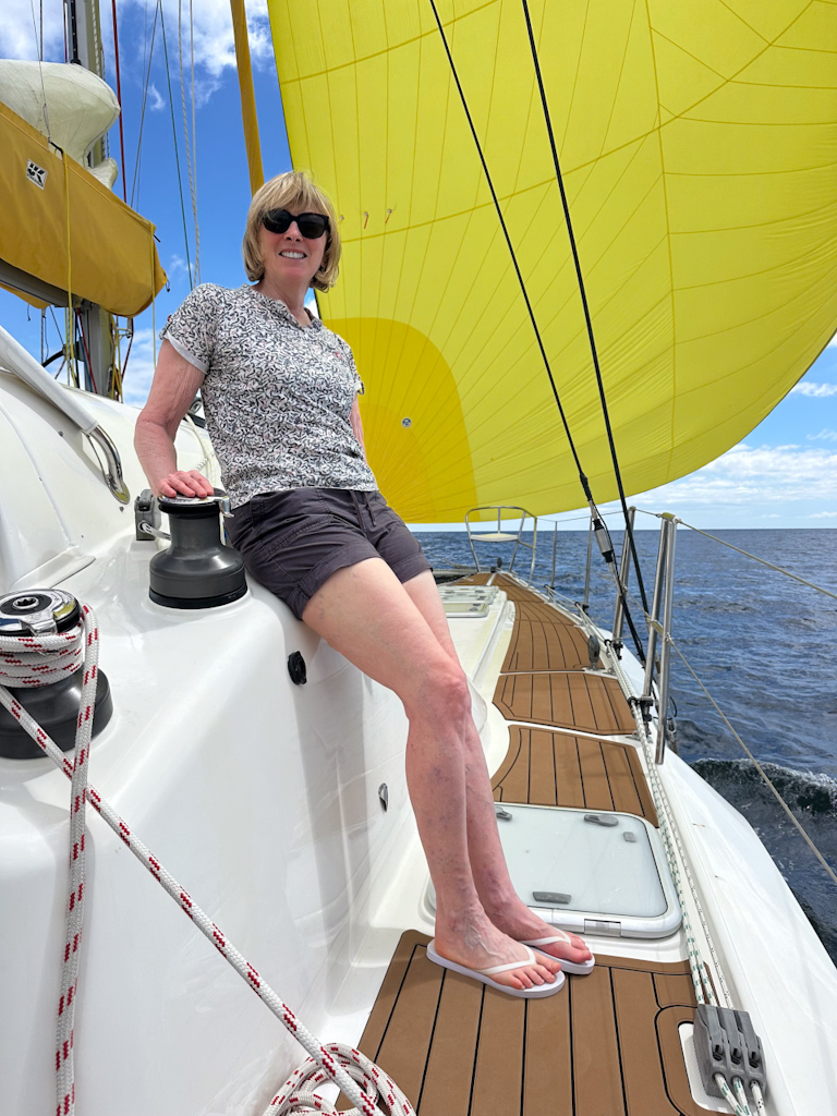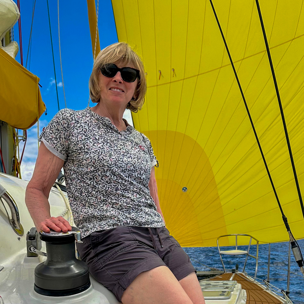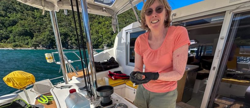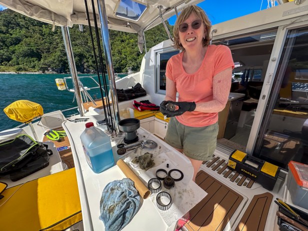 Armed with a selection of YouTube videos, various tools, a collection of replacement springs and pawls and some suitable grease and oil, she managed to service all six winches while we were anchored in a beautifully calm spot next to our local fishing wharf.